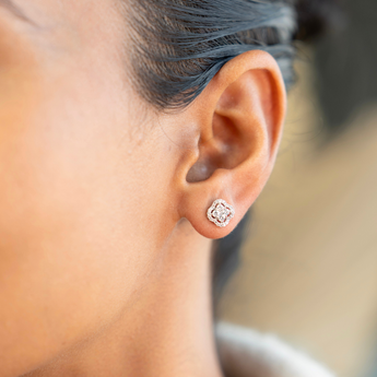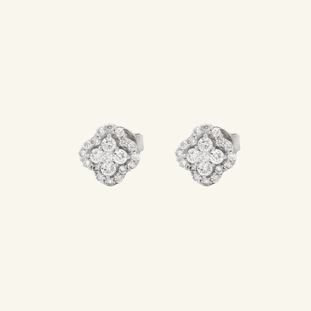 The Clover Diamond Studs feature round diamonds arranged in a clover design, surrounded by a border of pave diamonds creating a clean and elegant look. These studs seamlessly transition from solo statement pieces to curated earring combinations.