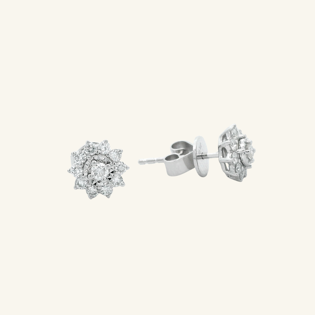 The Eira Diamond Studs feature a floral-inspired floret motif with round diamonds, beautifully set in 18K gold for a warm, feminine touch. Designed for effortless wear, they sit comfortably at the lobe and deliver refined brilliance for everyday elegance or layered looks.