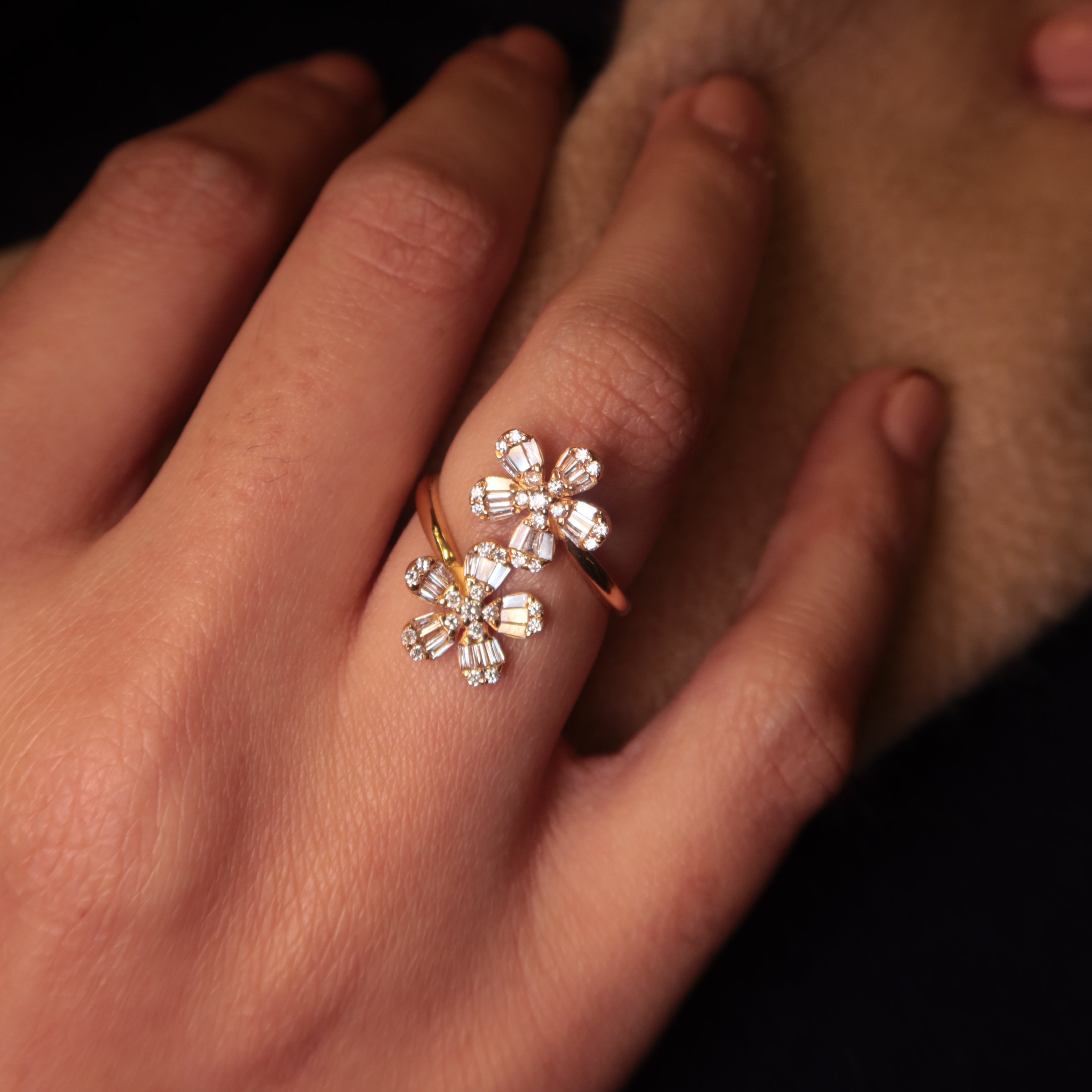 The Izzy Diamond Ring features baguette and round diamonds arranged in a twain flower design, gracefully wrapping around the finger. Its elegant and artistic layout makes it ideal for elevating everyday wear or for special occasions.