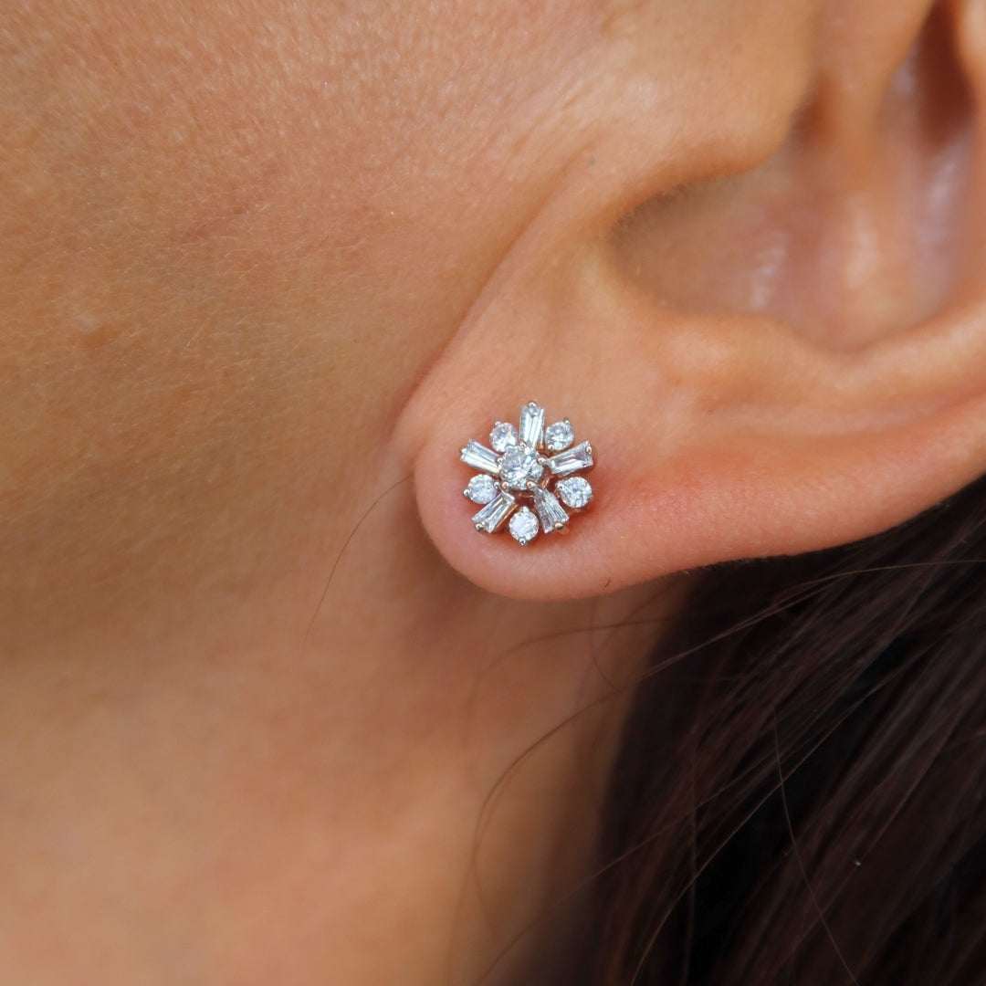 The Levi Rose Diamond Studs feature a floral-inspired floret motif with taper baguettes and round diamonds, beautifully set in 18K rose gold for a warm, feminine touch. Perfect for everyday wear or as a sophisticated statement piece.