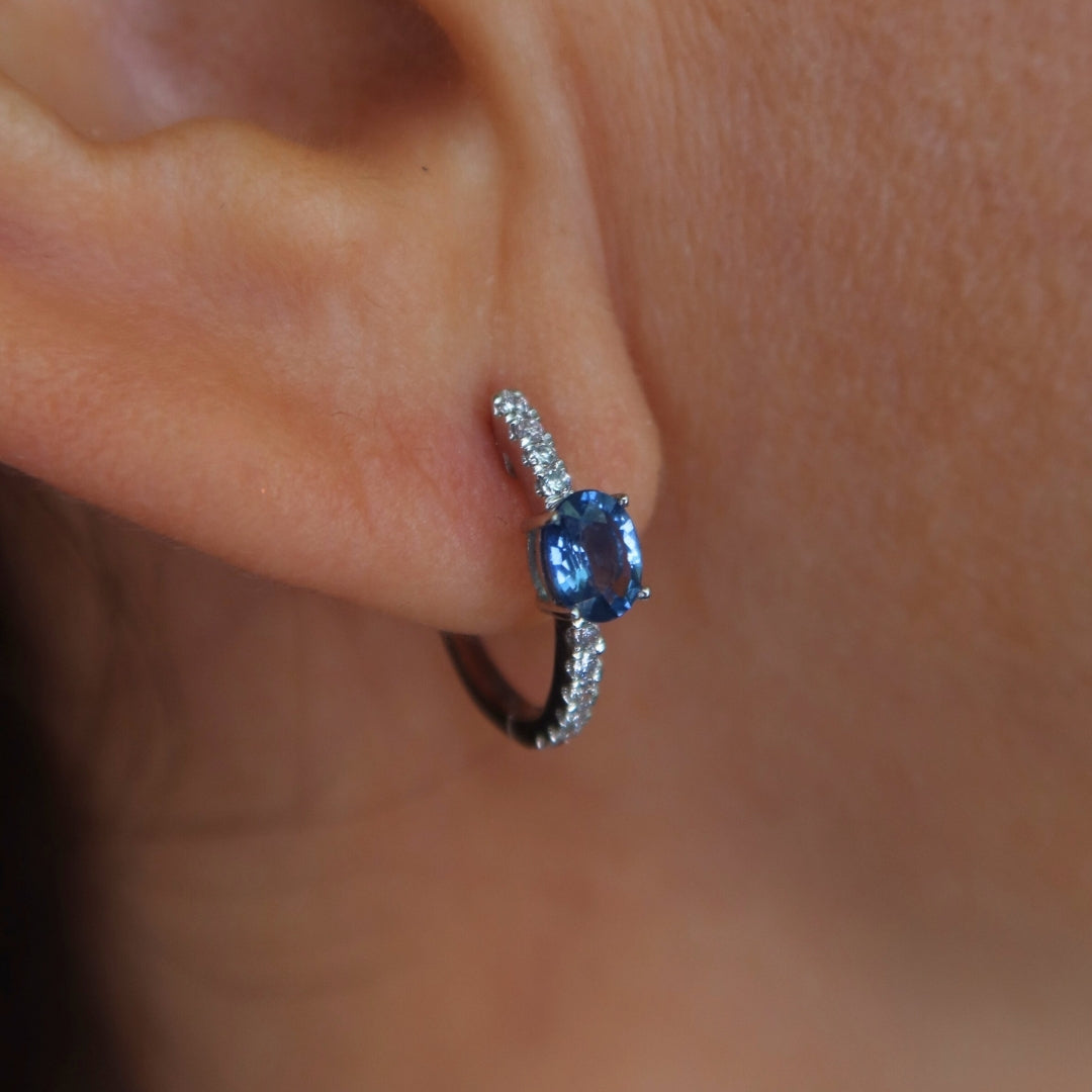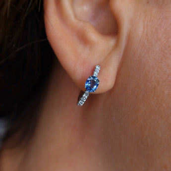 Streamlined and modern, huggies never go out of style. Phoebe Earrings are perfect for any look, they are casted in white gold with round diamonds and an oval sapphire at the centre