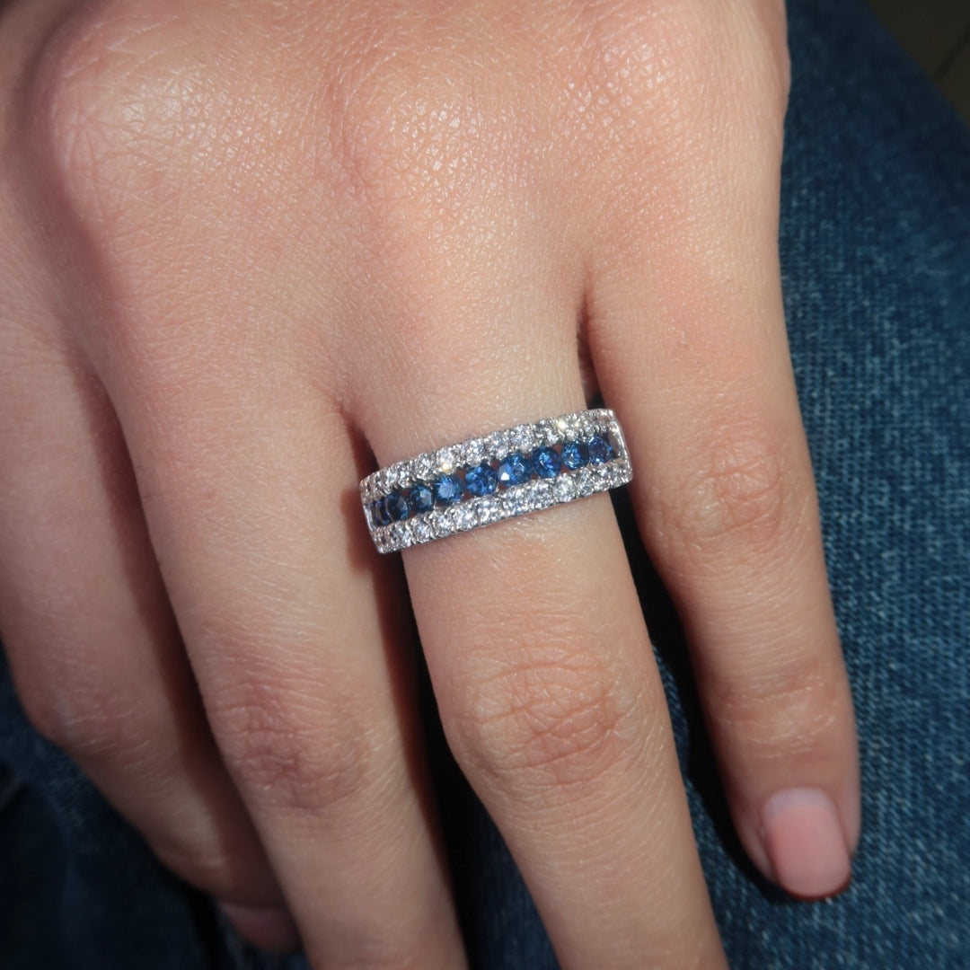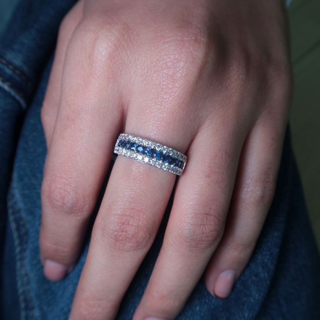 The Shaely Blue Sapphire Diamond Ring features round diamonds paired with vibrant blue sapphires set on a sleek white gold band, creating a subtle yet elegant contrast. Its versatile design makes it perfect for everyday wear or for adding a pop of color to evening attire.