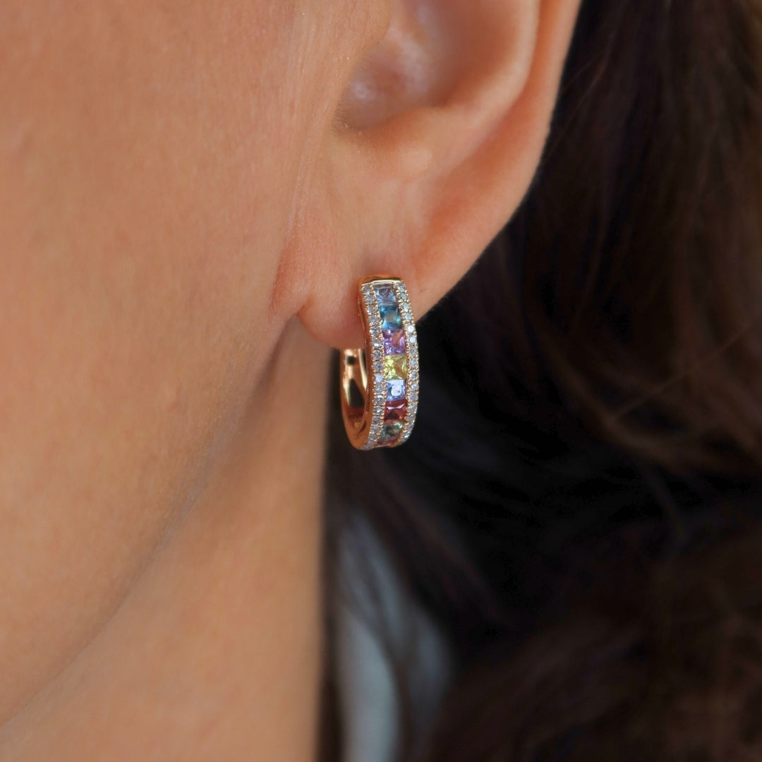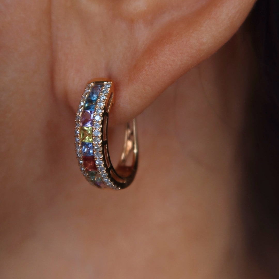 These prismatic earrings in flattering pastels is formed from an array of colour gemstones and bordered by round diamonds, set in rose gold. It is an ultimate touch to any outfit.