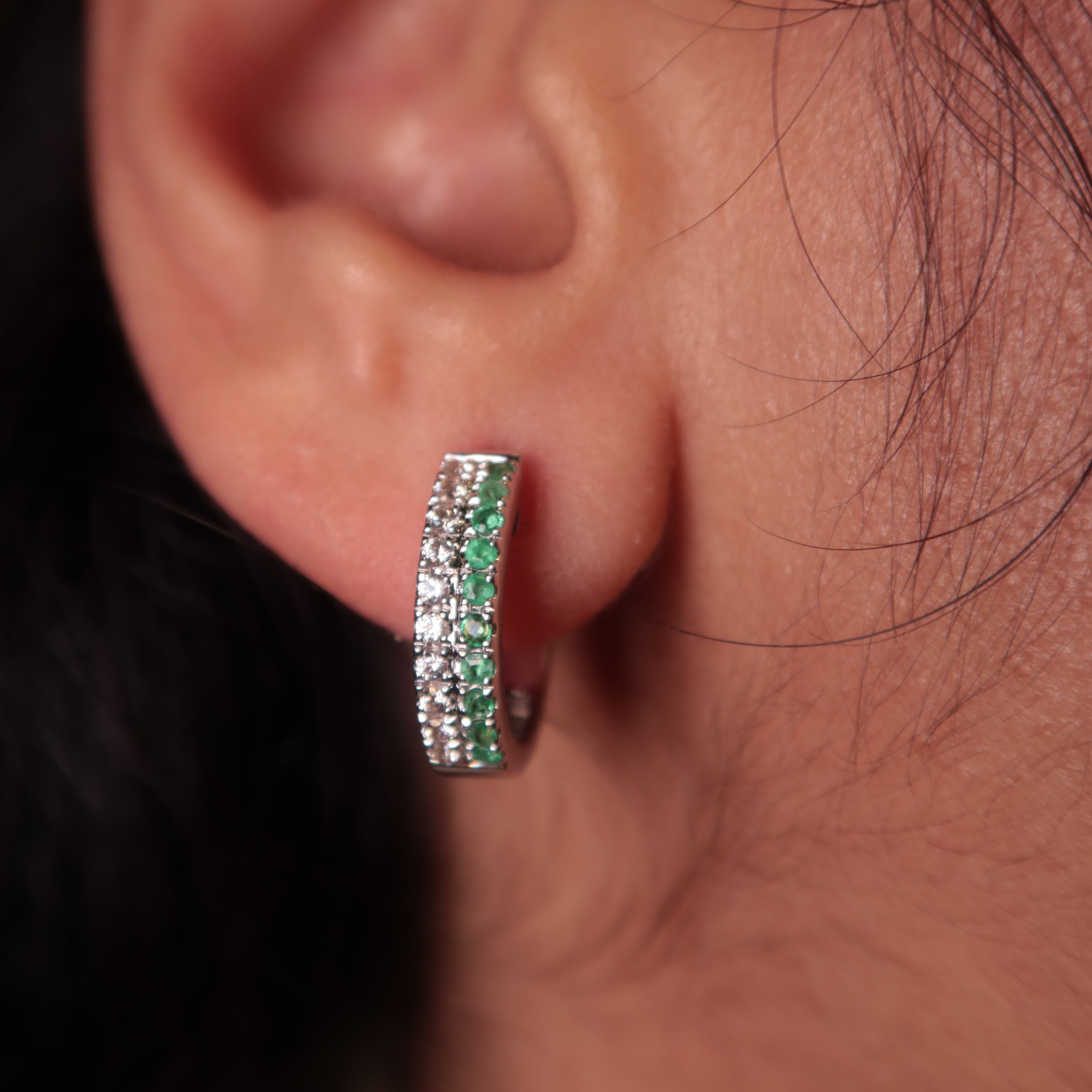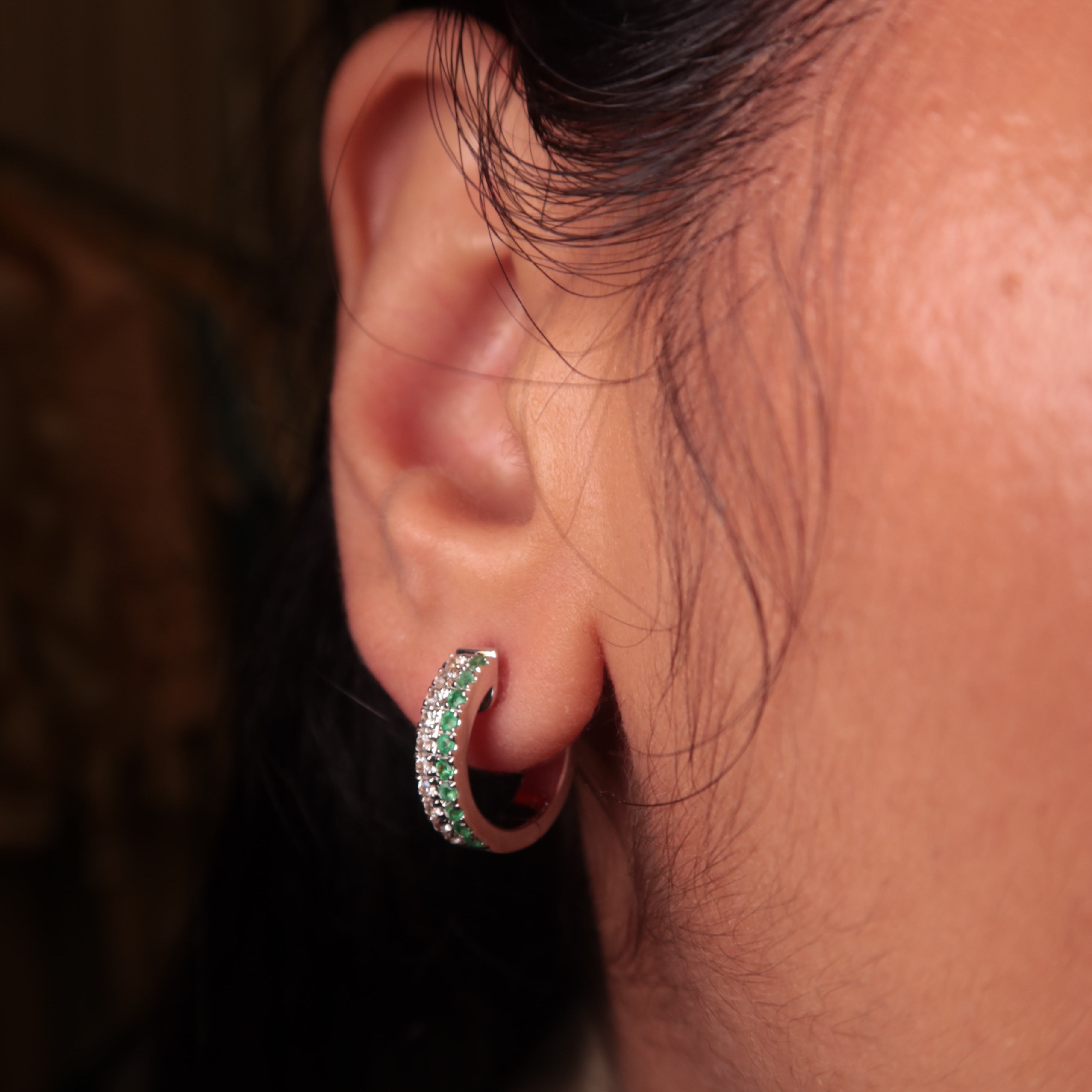 The Rey Emerald White Sapphire Huggie Earrings feature parallel lines, one adorned with vibrant emeralds and the other with glistening white sapphires, creating a modern, layered look. The snug huggie style ensures a comfortable fit, making them perfect for everyday wear or stacking with other piercings.