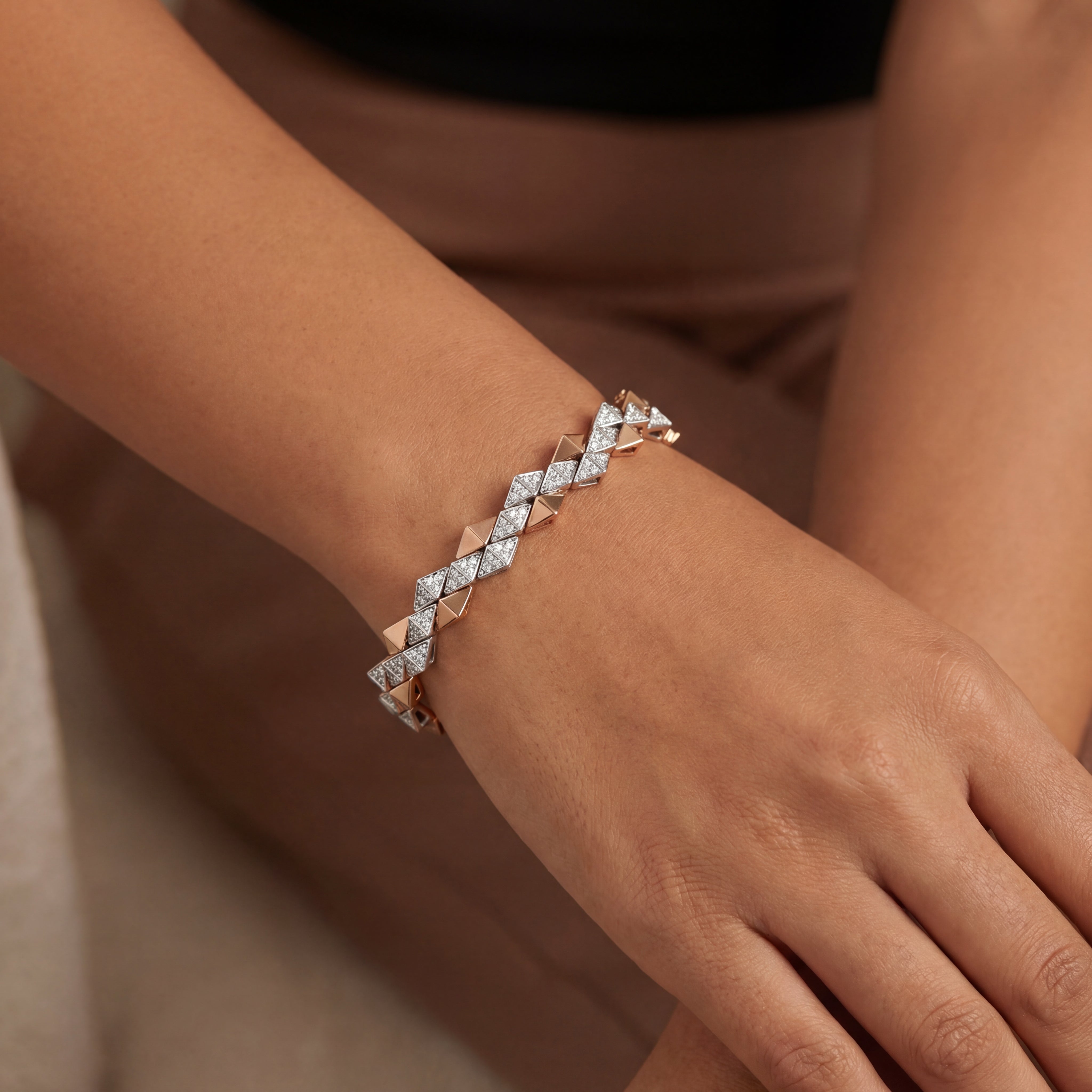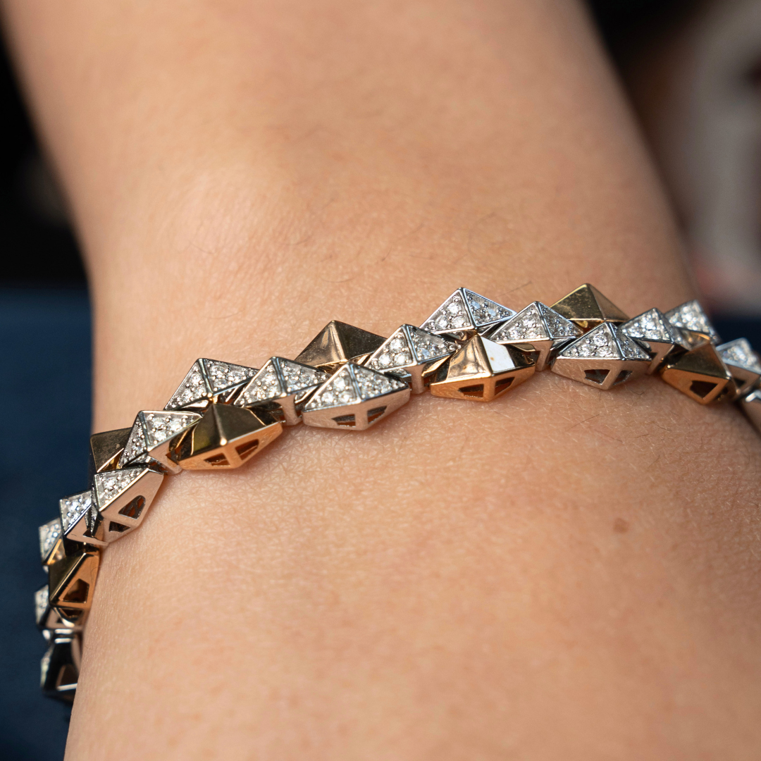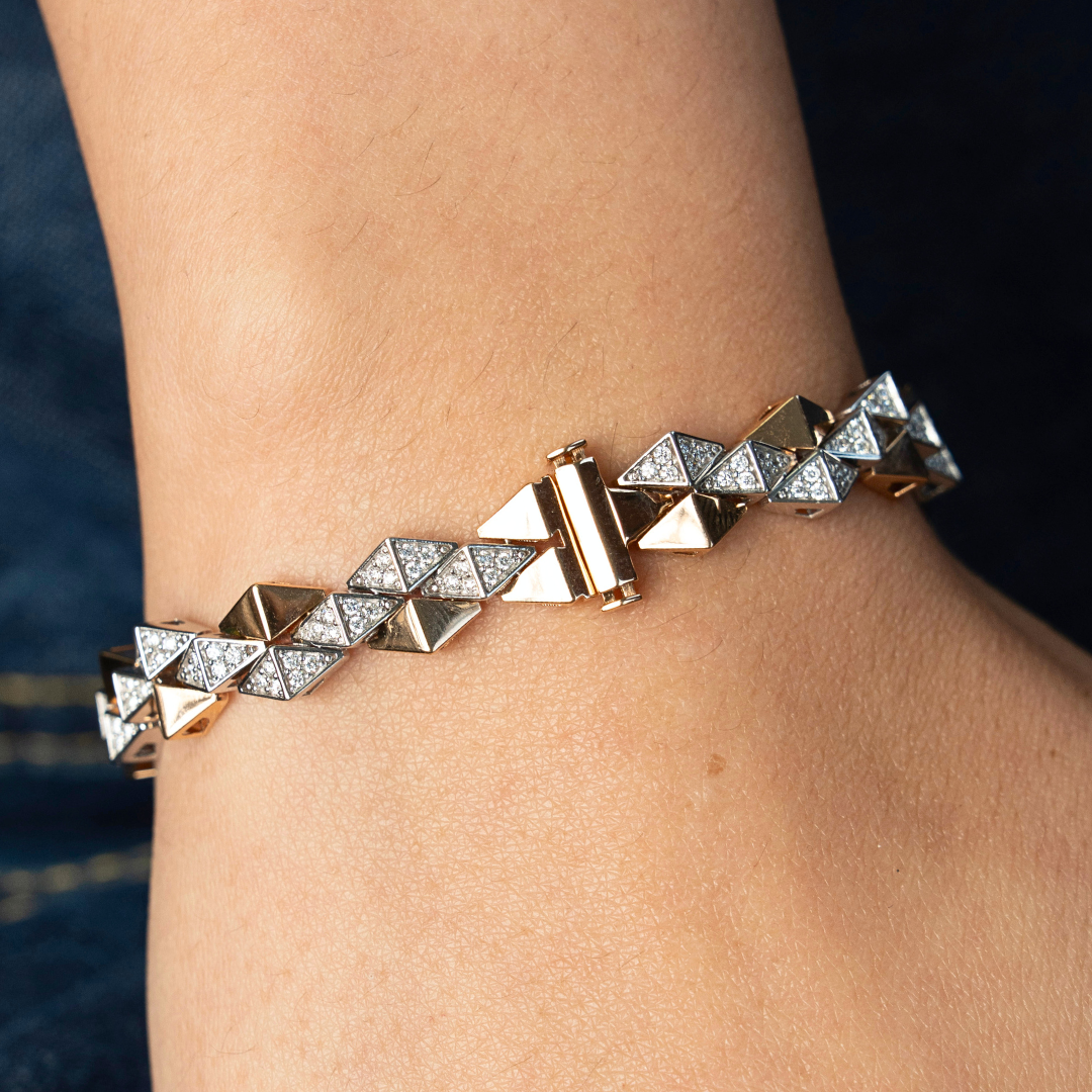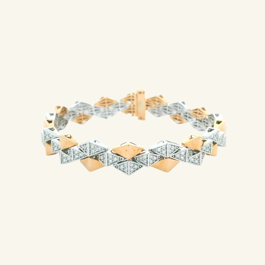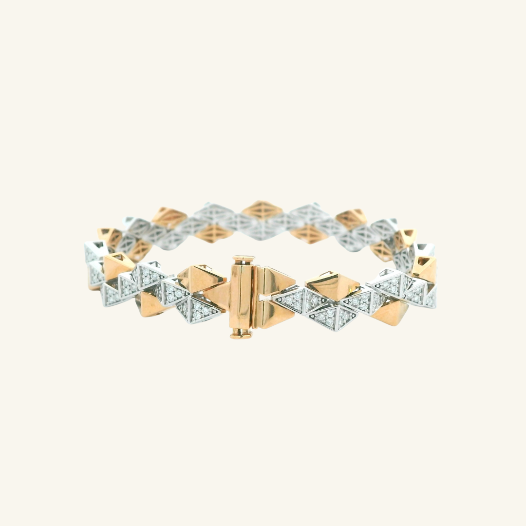A bold take on everyday luxury. The Tessera Diamond Bracelet features alternating geometric links in polished yellow gold and diamond-set white gold, creating a striking play of structure and sparkle. Pavé-set natural diamonds add subtle brilliance, while the articulated design moves effortlessly with the wrist.