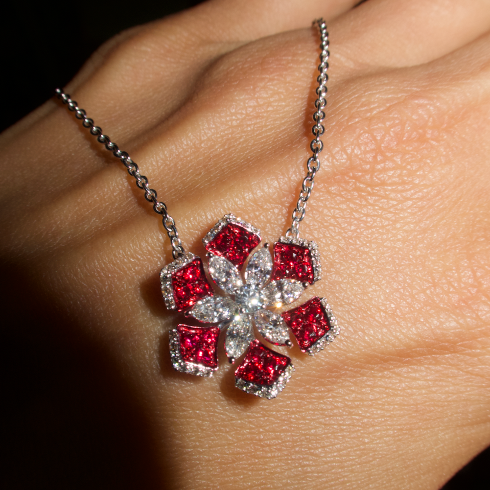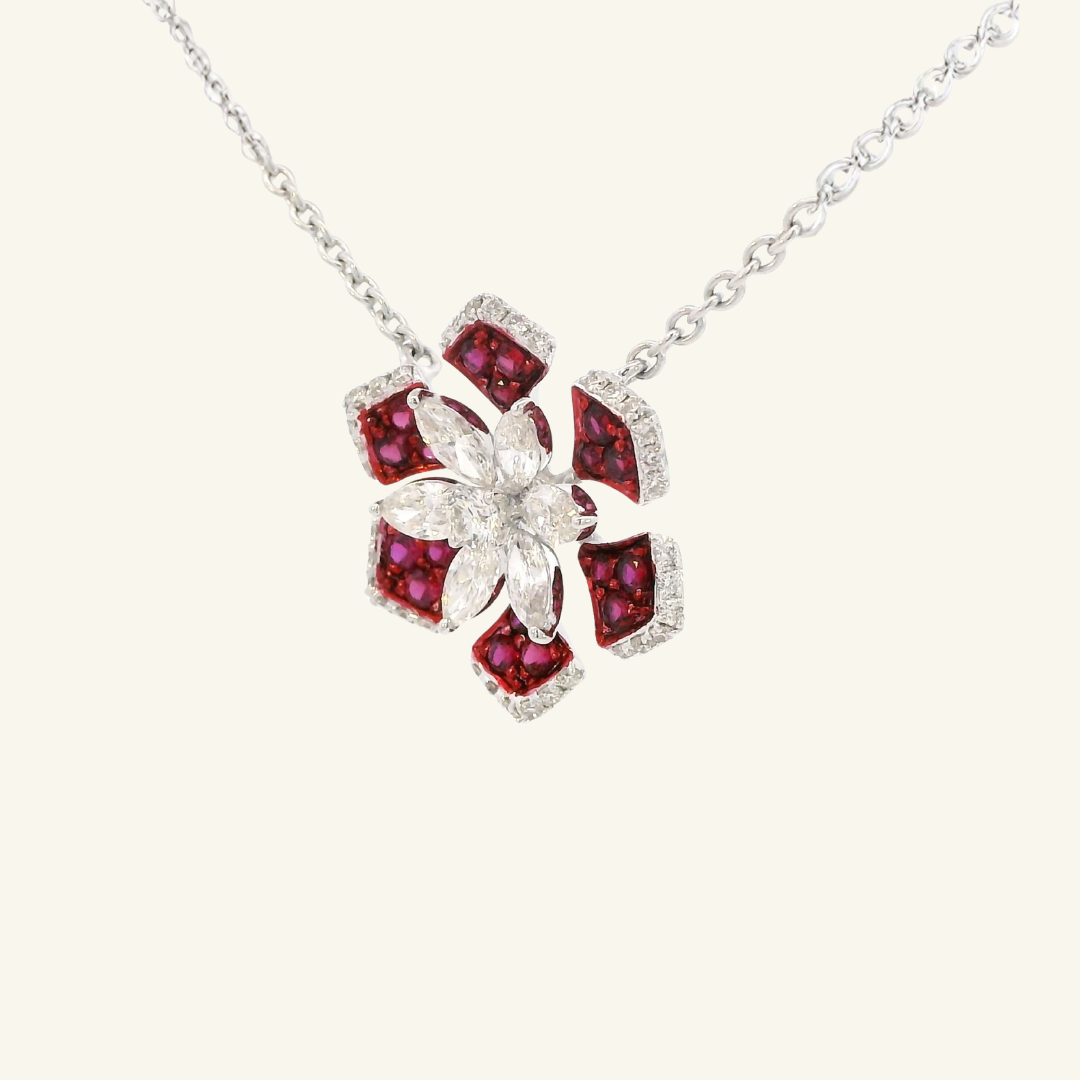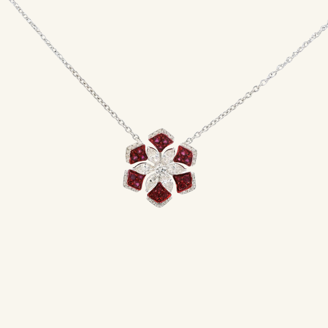 The Chloe White Gold Ruby Diamond Necklace embodies classic luxury with a modern edge, featuring rich red rubies arranged in a geometric floral motif, framed by brilliant diamonds. Set in 18K white gold, this piece is a striking yet elegant statement.