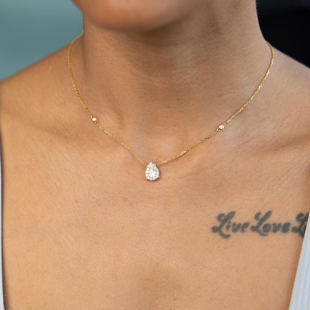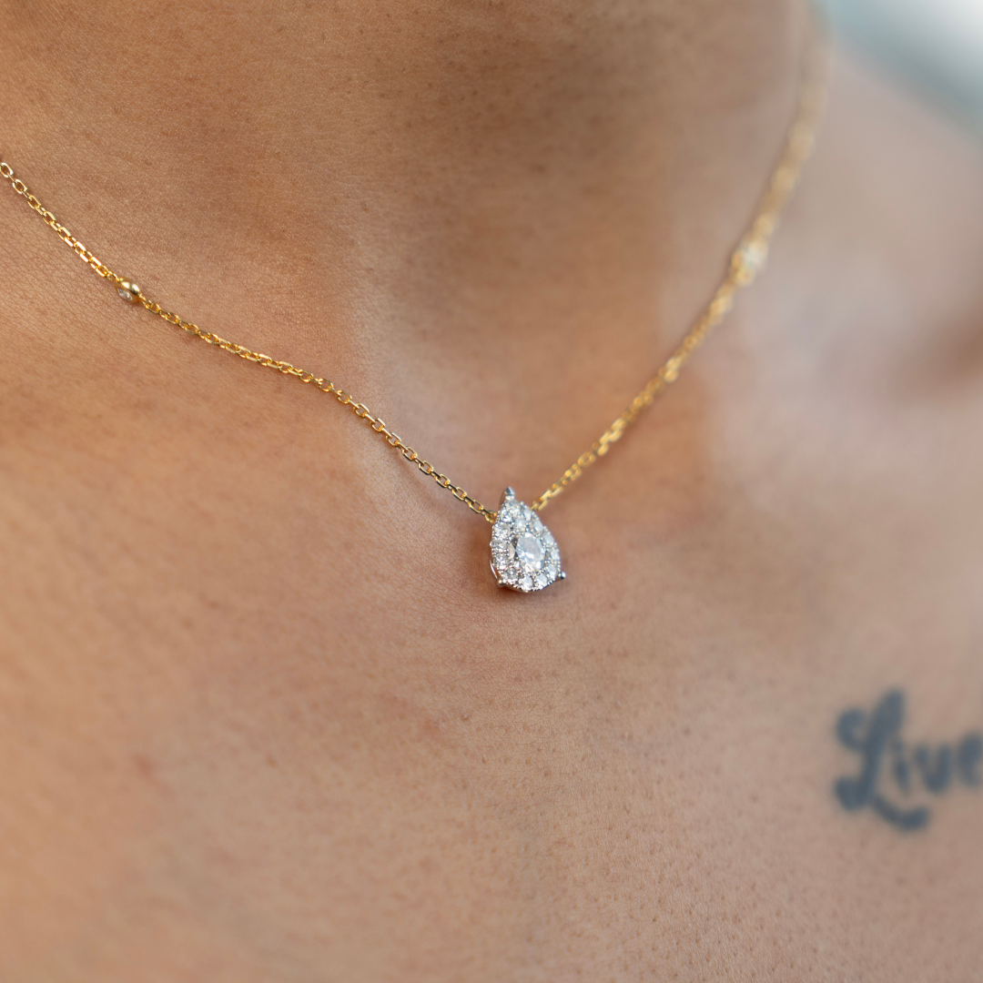 The Lia Pear Diamond Necklace sparkles with a pear-shaped diamond set in an illusion style. This charming pendant blends classic elegance with a simple, fresh vibe. Whether you stack it up or let it shine on its own, it’s ready to add a touch of sparkle to any look.