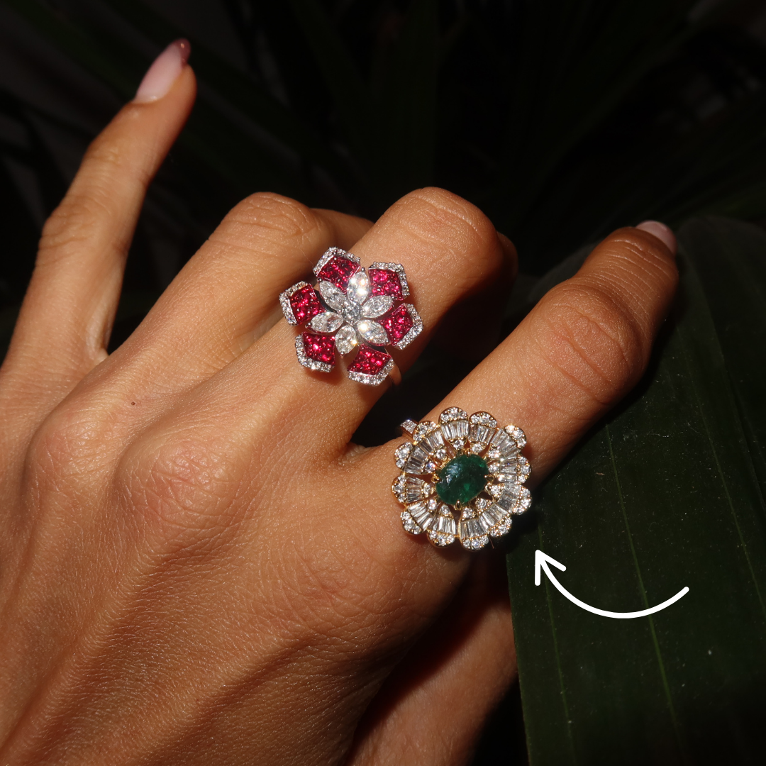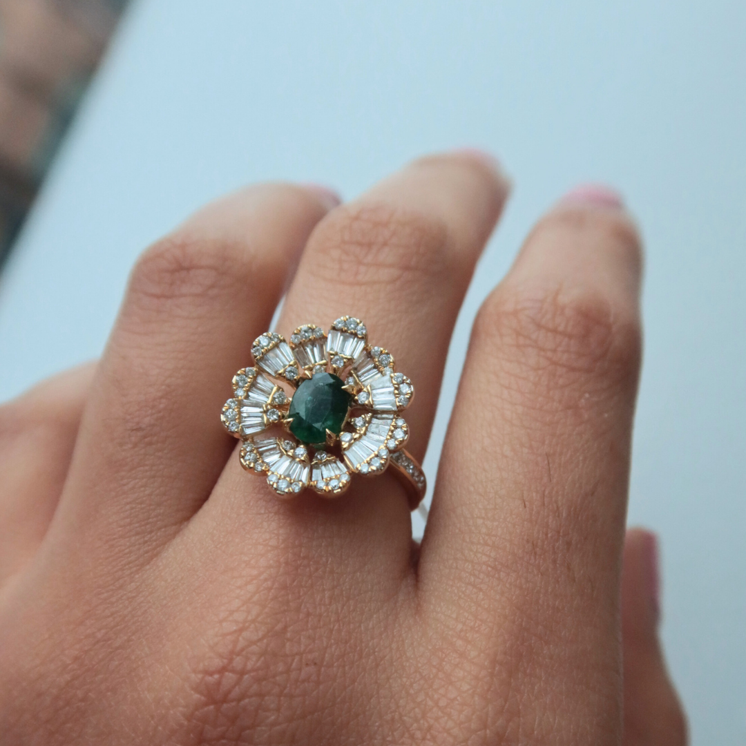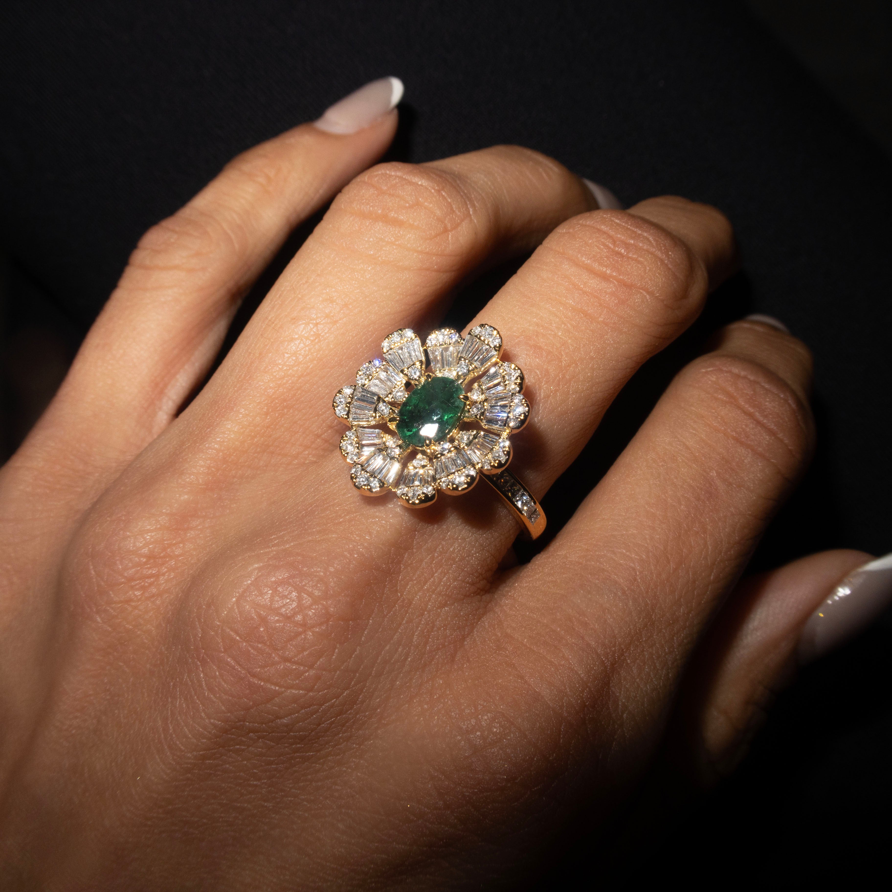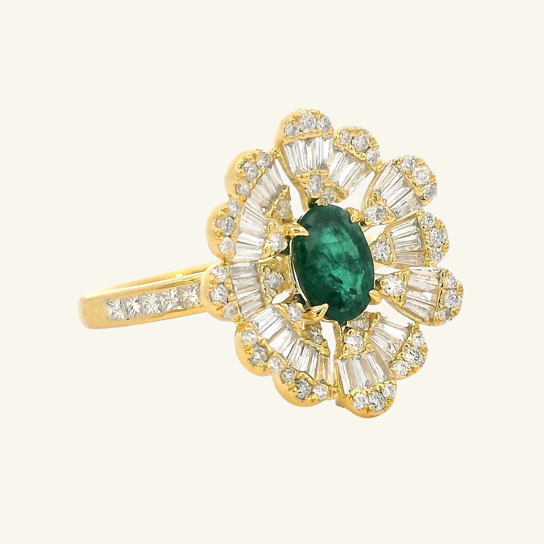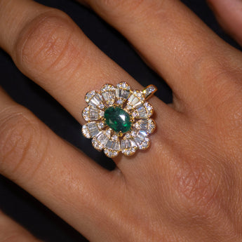A statement ring made for you to stand out. Handcrafted using 18k yellow gold and a gorgeous pair of oval emeralds studded in the centre of taper baguettes and round diamonds.