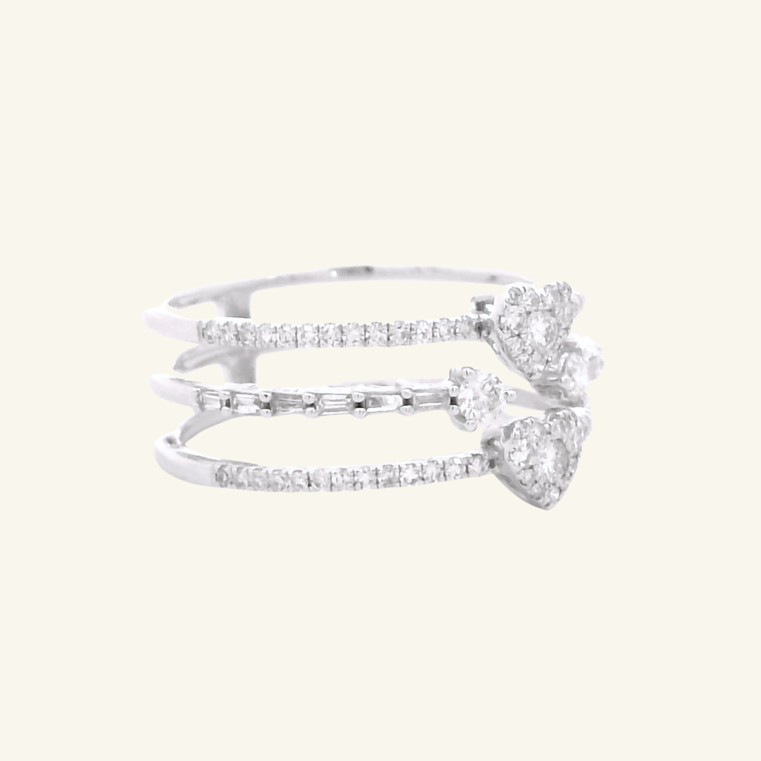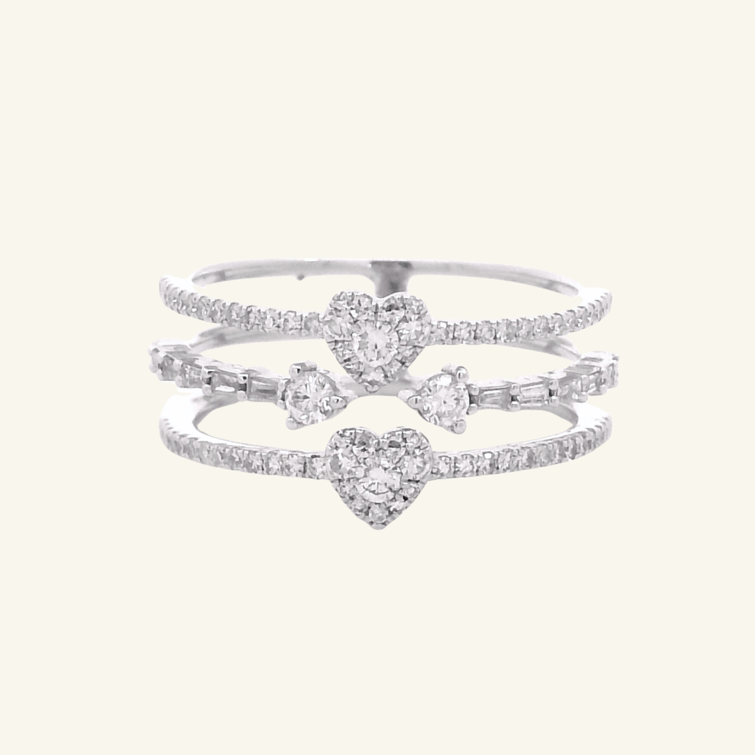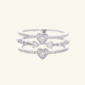 Delicate, layered, and effortlessly expressive. This diamond stack ring features heart-shaped diamond clusters paired with round brilliant pavé, while the center band highlights pear-shaped and baguette-cut diamonds for a refined contrast. Designed to be worn together or styled your way, it’s a modern expression of everyday romance; at your own pace.