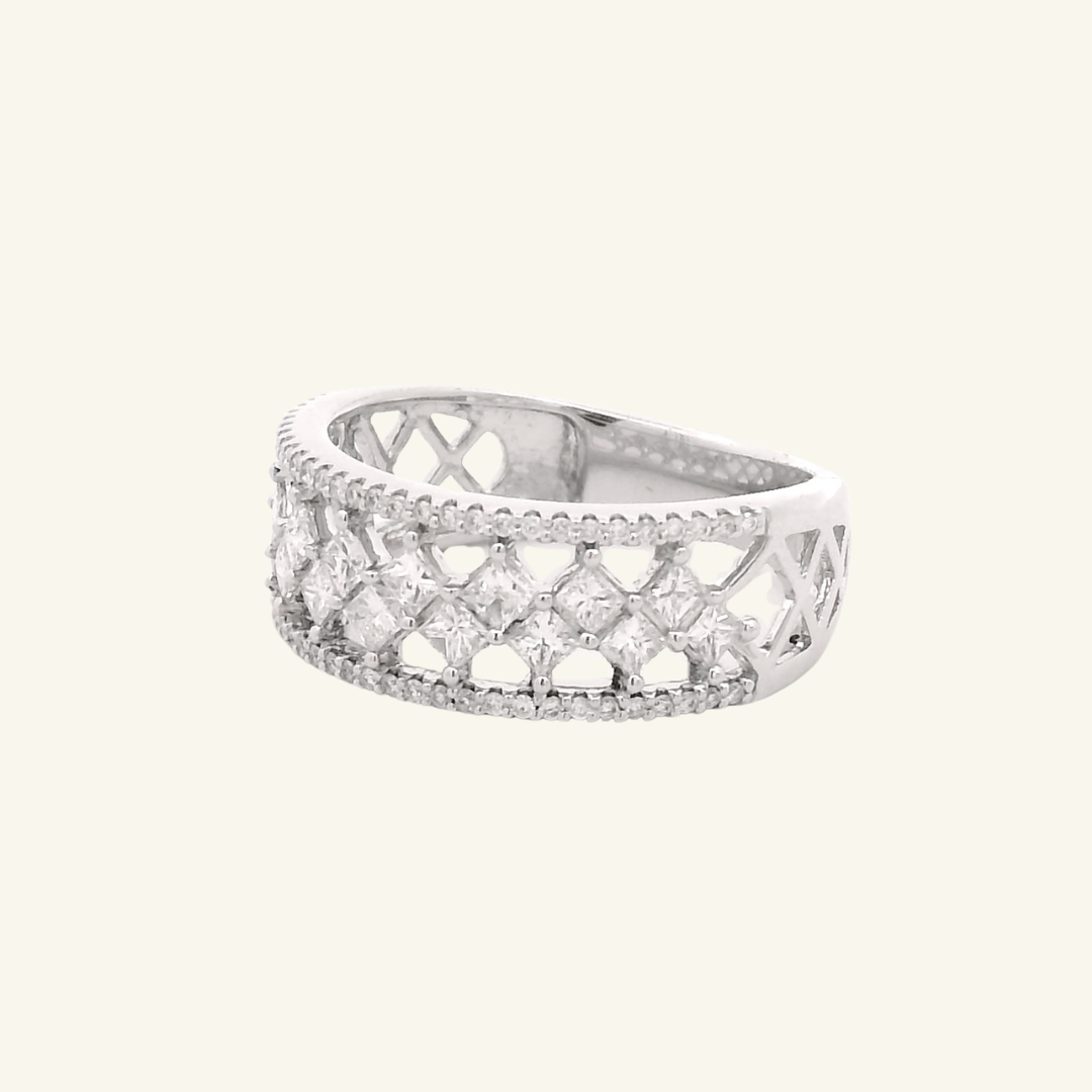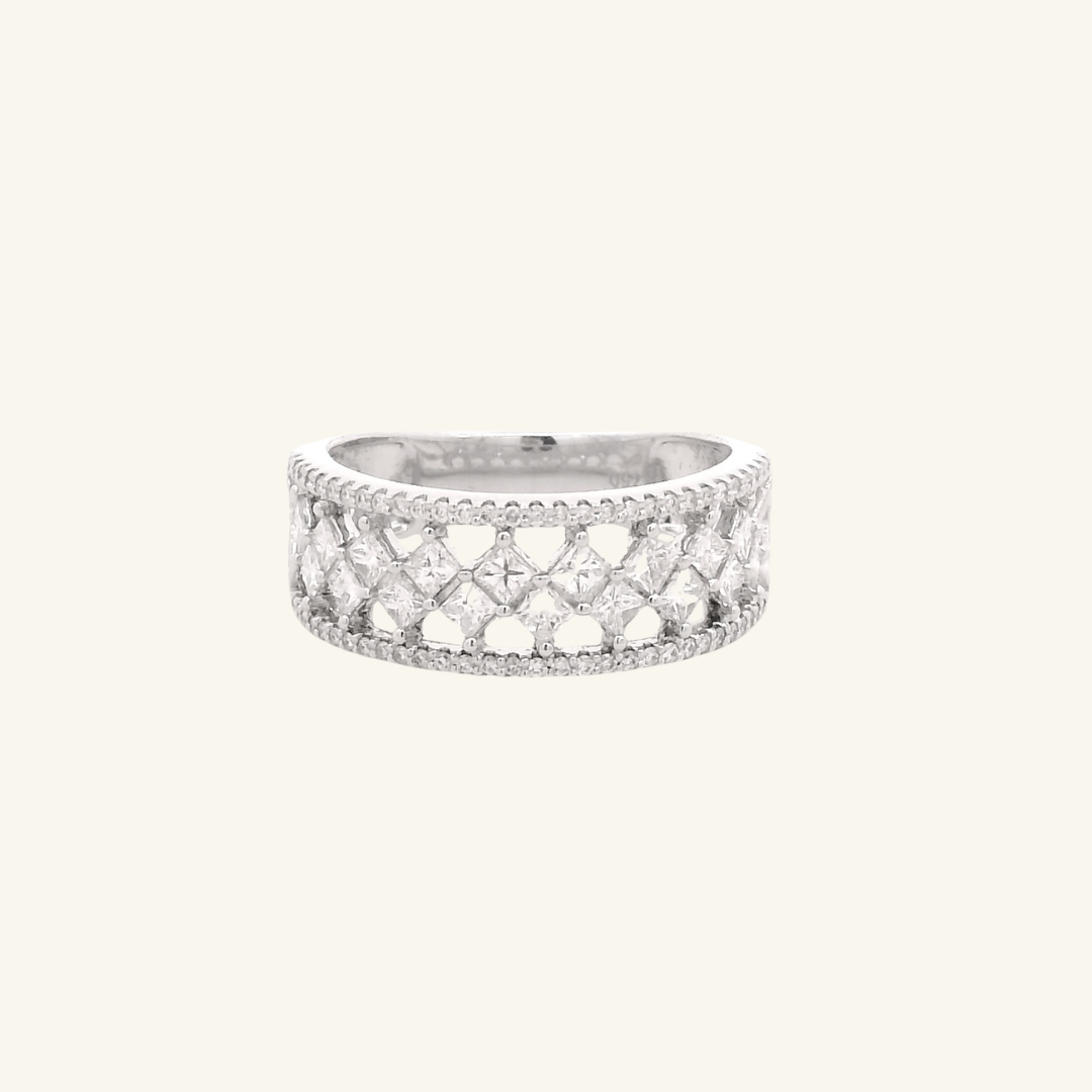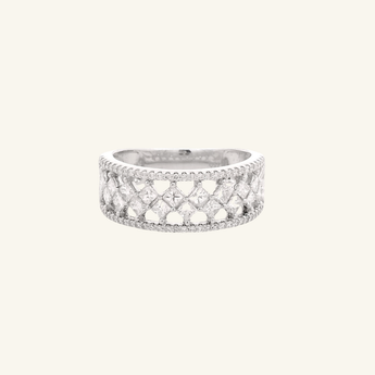 A modern take on a classic band, the Lumi Diamond Band features an open lattice design set with brilliant diamonds, framed by delicate pavé edges. Structured yet airy, this wide band offers bold sparkle without feeling heavy; perfect for everyday wear or stacking with finer rings.