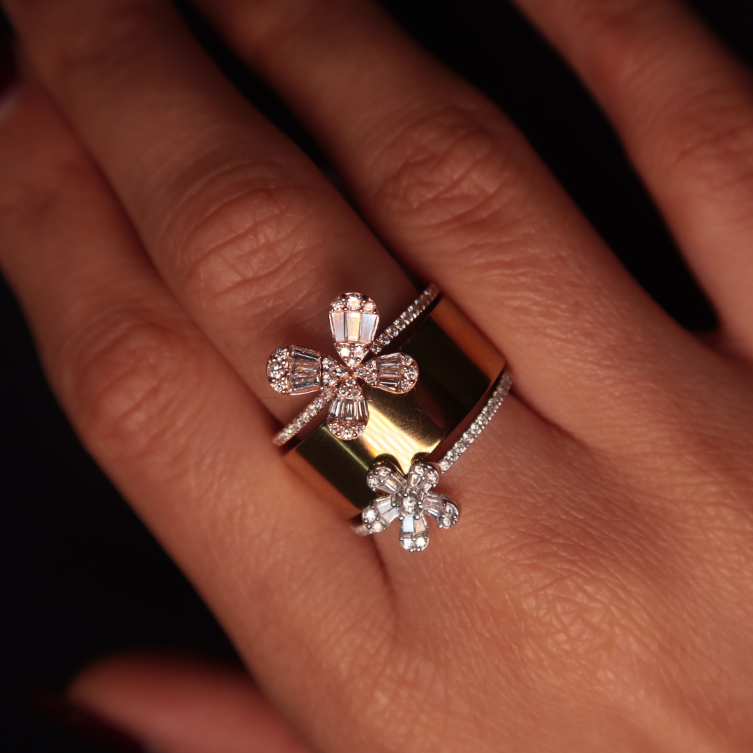 This Butterfly Baguette Diamond Ring features taper baguettes and round diamonds arranged in an elegant butterfly motif. Its delicate and whimsical design adds a playful touch, perfect for adding a hint of sparkle. Also, great for stacking with your Oura/Ultrahuman rings