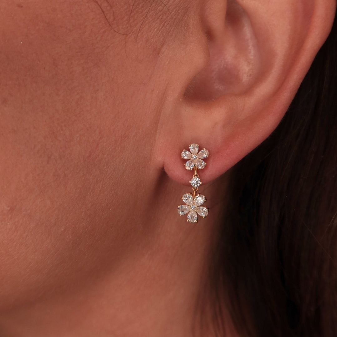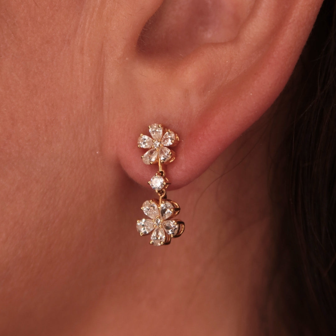 The Anne Earrings feature a delicate floral-inspired motif, crafted with pear and round diamonds set in 18K yellow gold. The suspended dangly design enhances movement and light reflection, making them an addition to any collection.