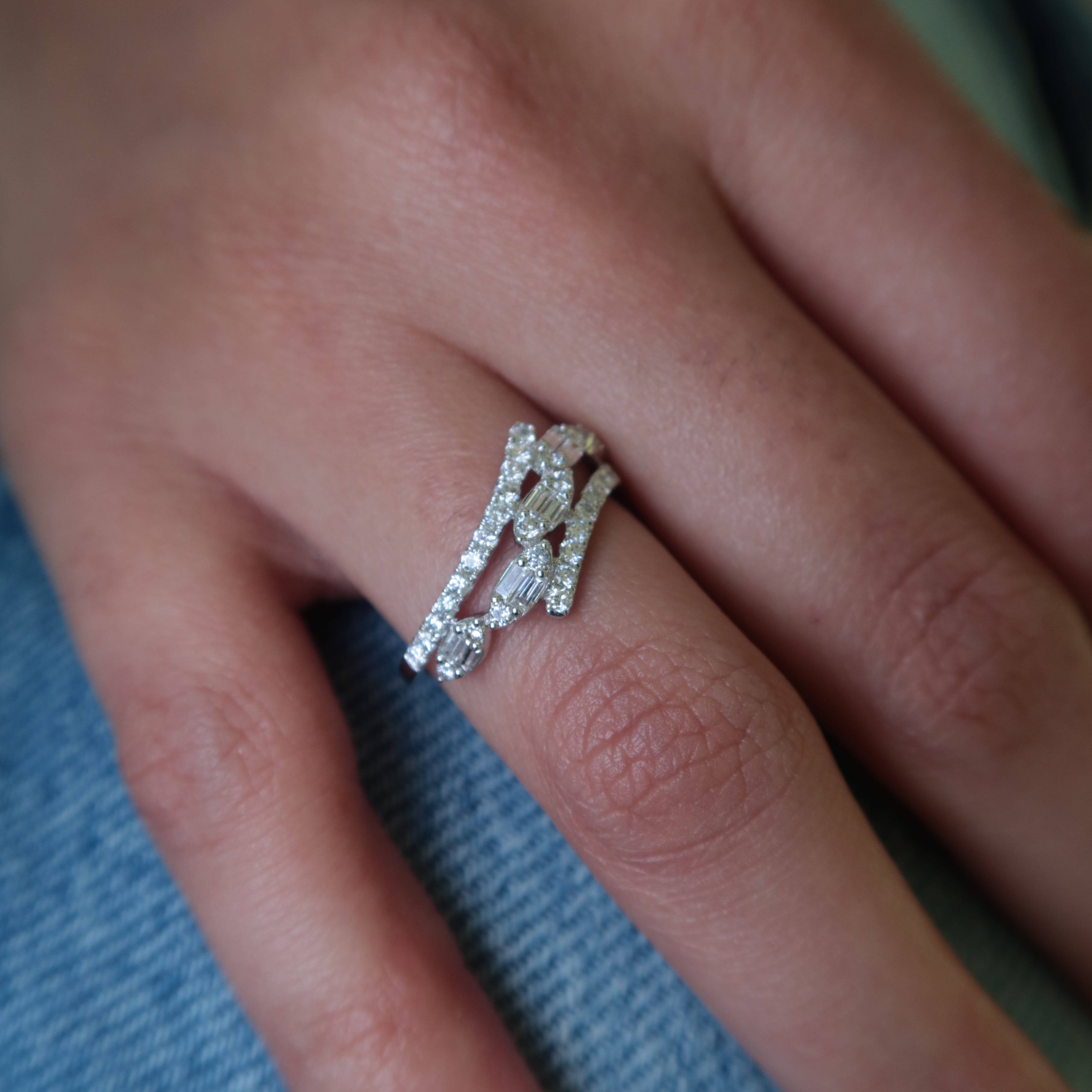The Ascend Diamond Ring features illusion marquise diamonds arranged in a tiered design, creating a dimensional and modern look.