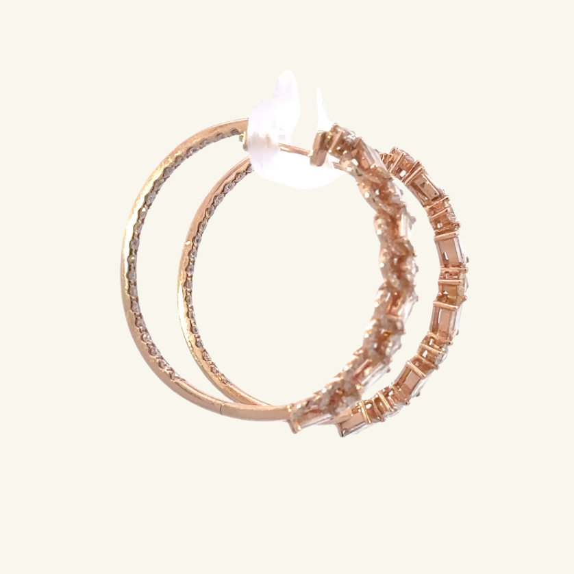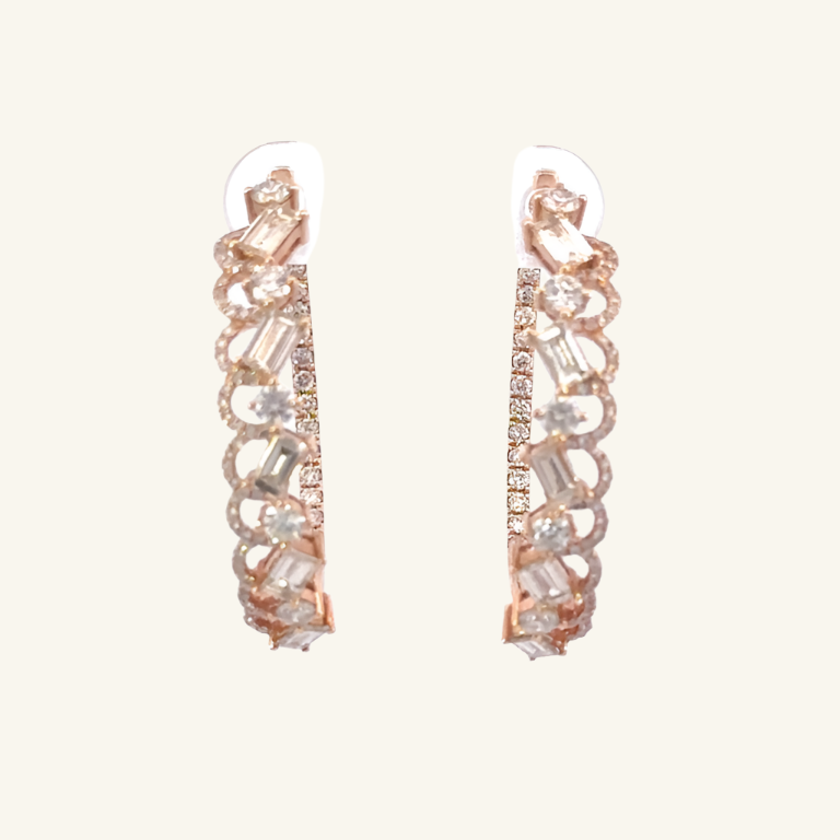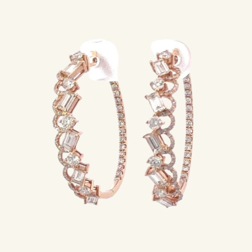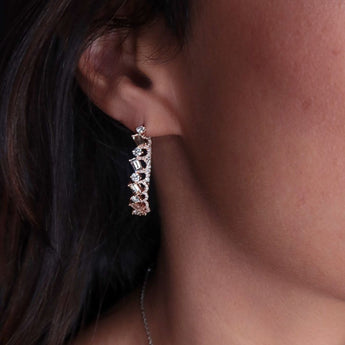 A modern take on the classic hoop, these baguette-adorned earrings offer timeless elegance. Designed in rose gold, they bring effortless sparkle to any outfit.