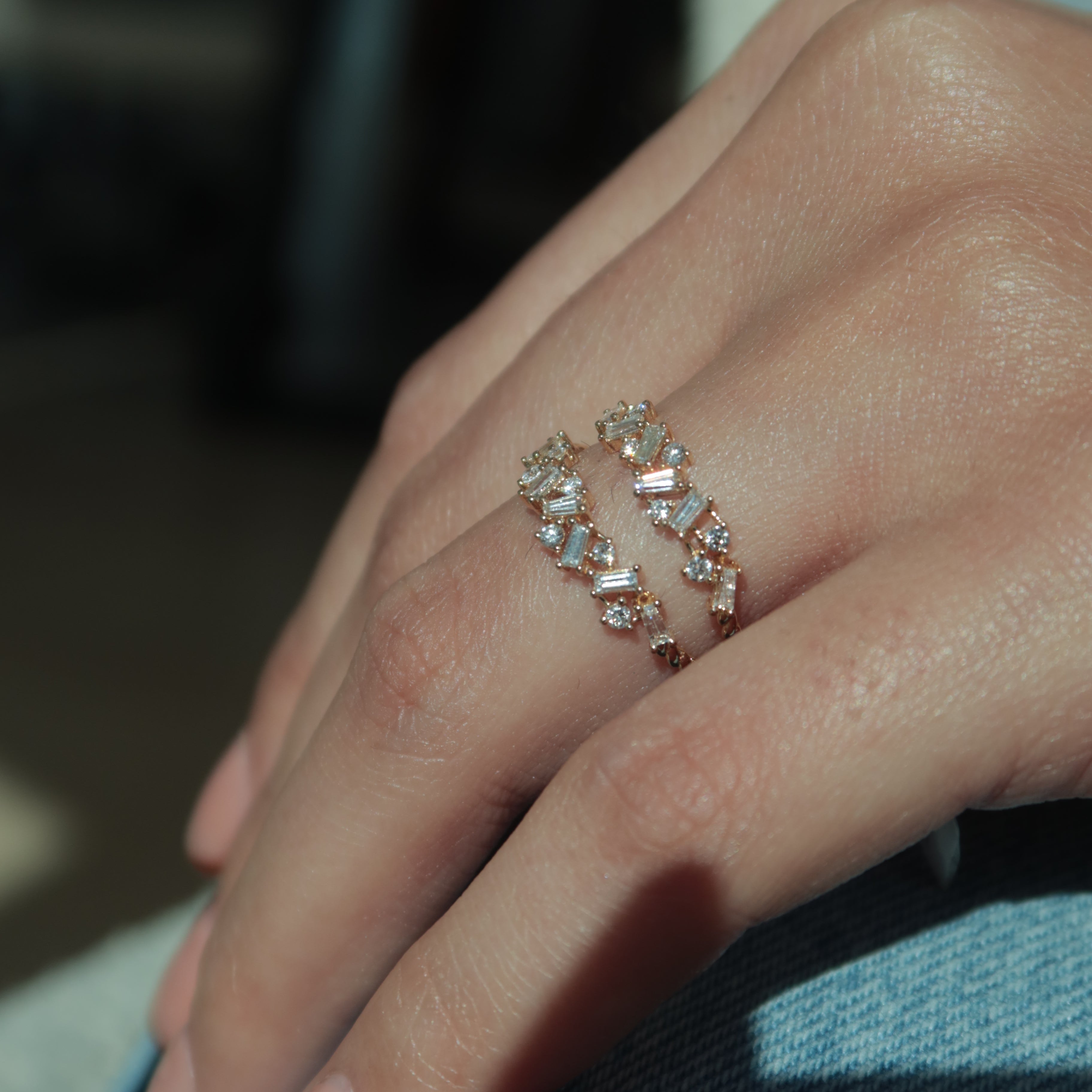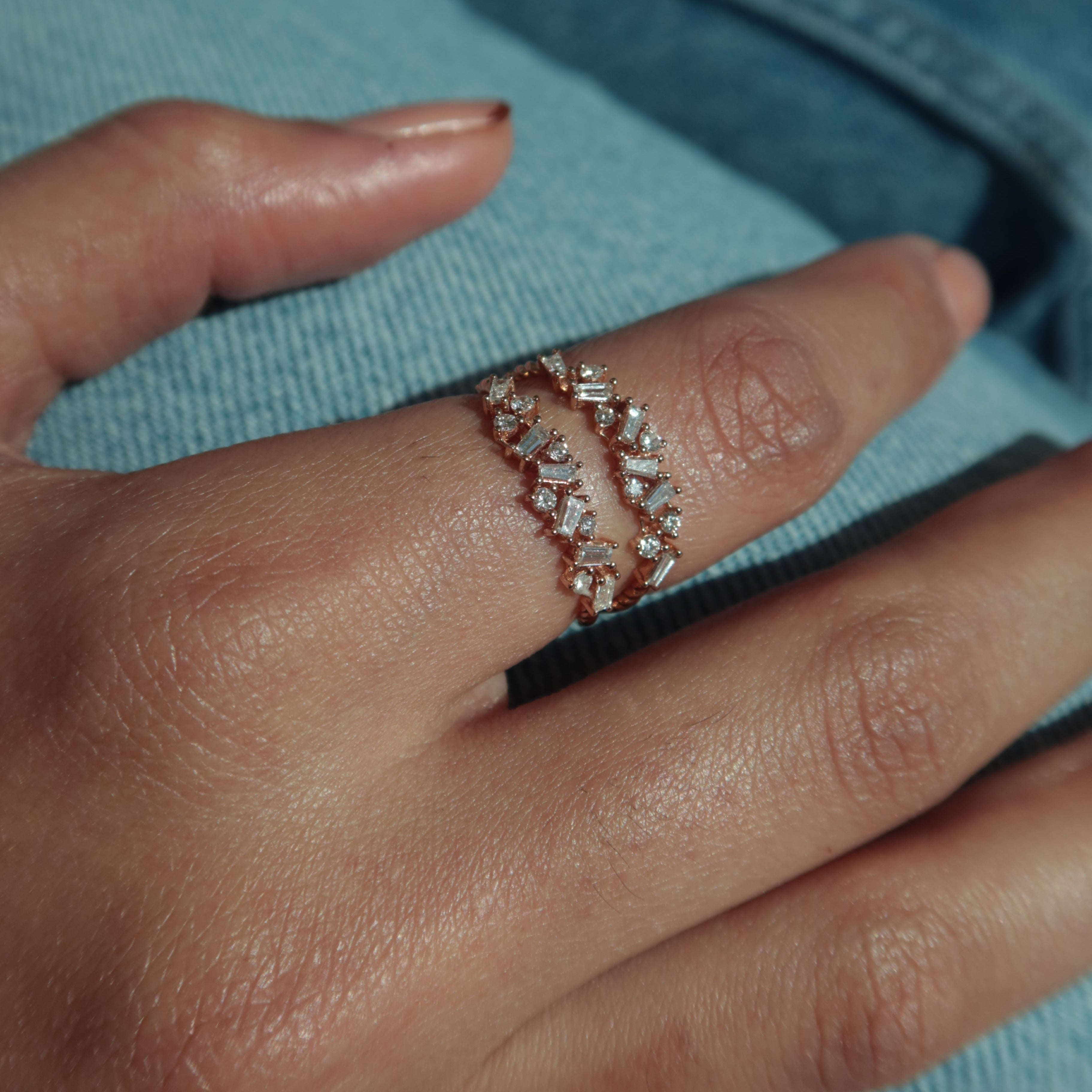 The Double Baguette Diamond Ring features two parallel baguette diamonds set on a slim gold band, creating a modern and structured look. Its minimalist design makes it versatile for everyday wear or for layering with other rings.