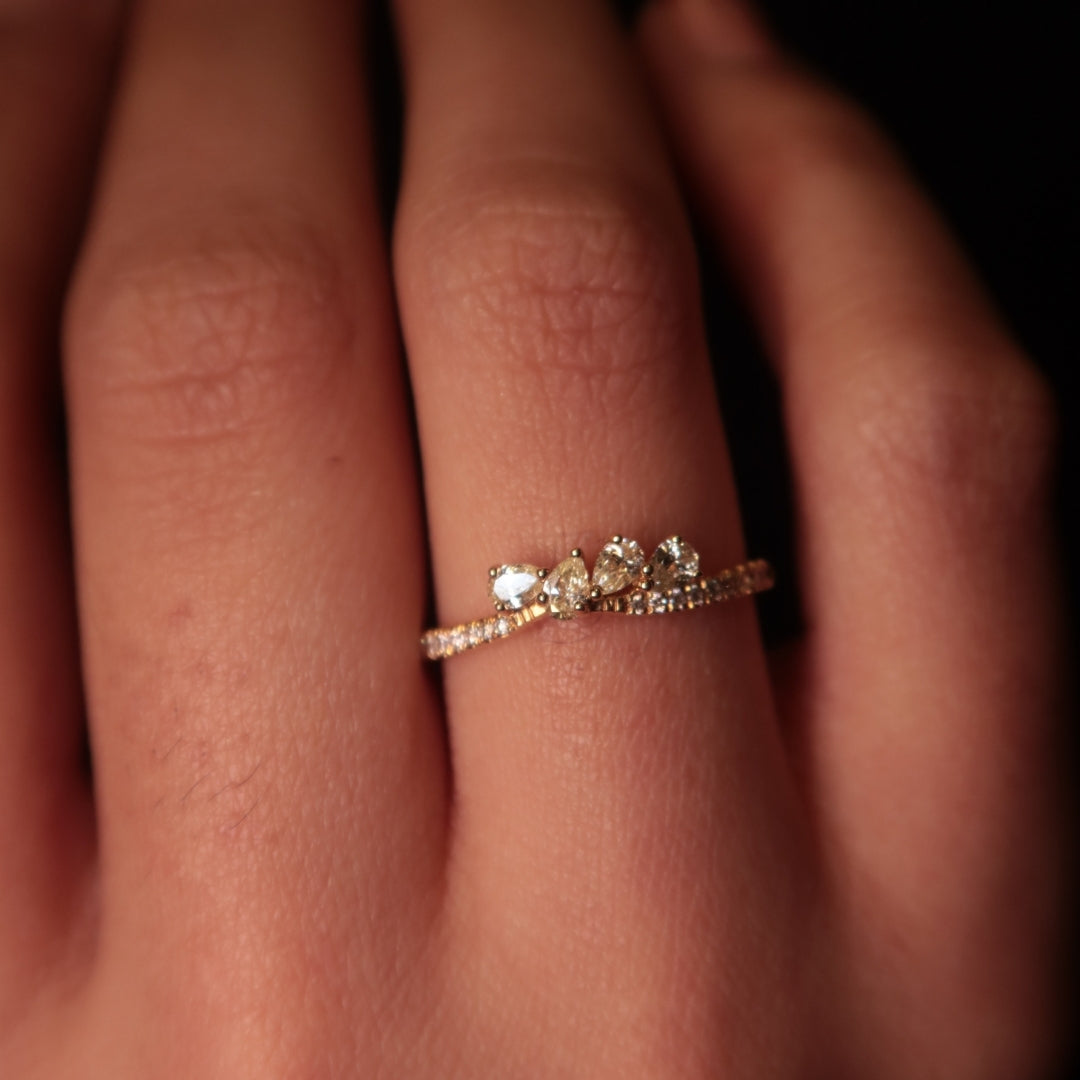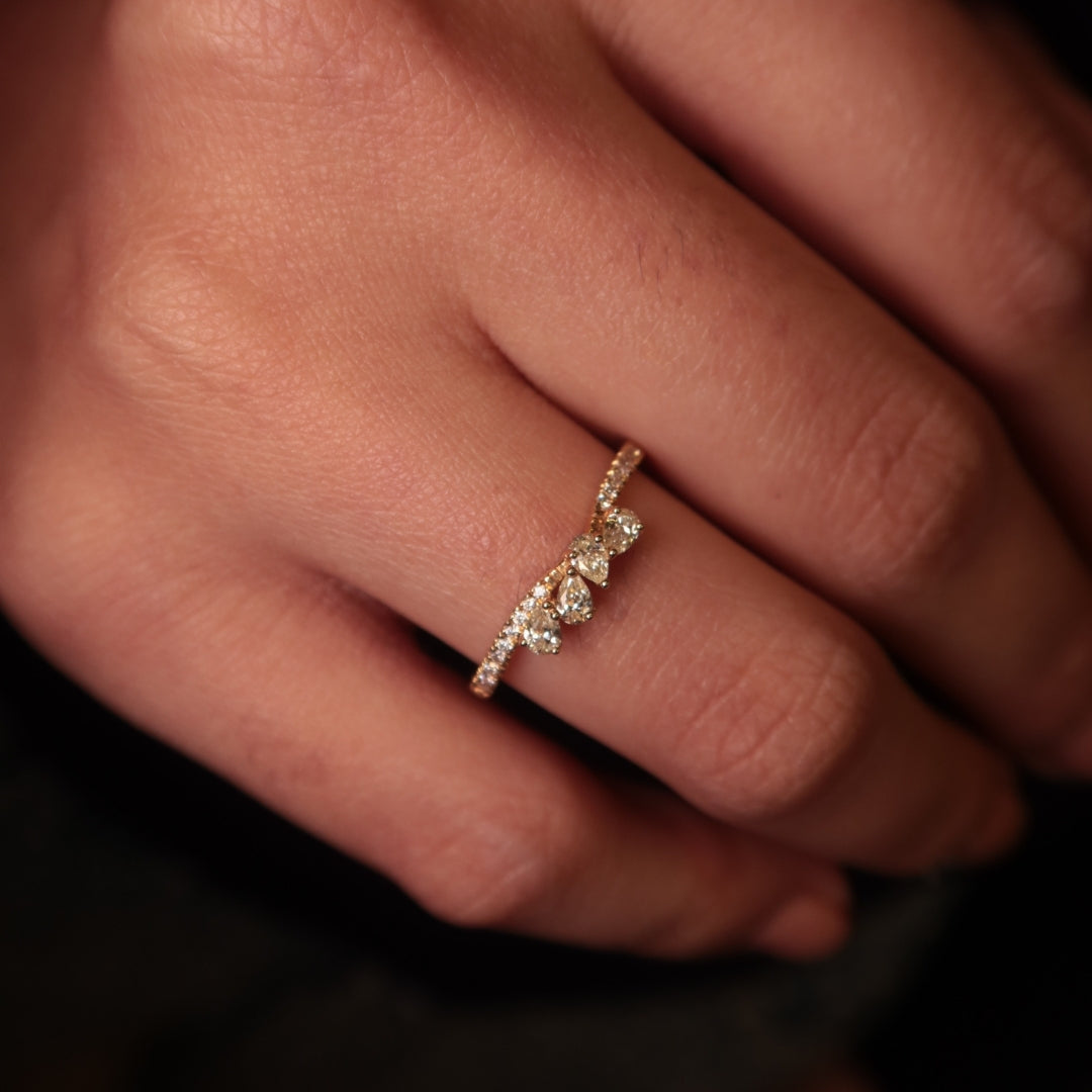 The Drew Peitit Diamond Ring features round and four pear-shaped diamonds set asymmetrically along a slim gold band, creating a dainty and modern look. Its minimalist yet elegant design makes it versatile for everyday wear.