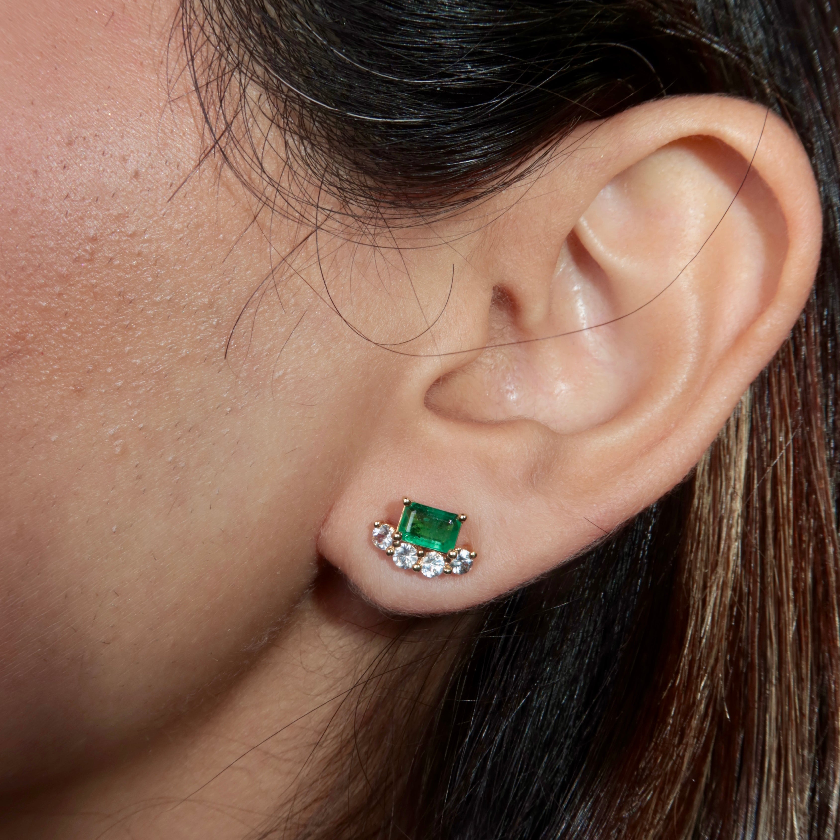The Zambian Emerald sapphire Studs feature a vivid emerald-cut center surrounded by a half halo of sparkling white sapphires, creating a vibrant pop of color. The playful yet elegant design makes them perfect for everyday wear or adding a touch of color to layered looks.