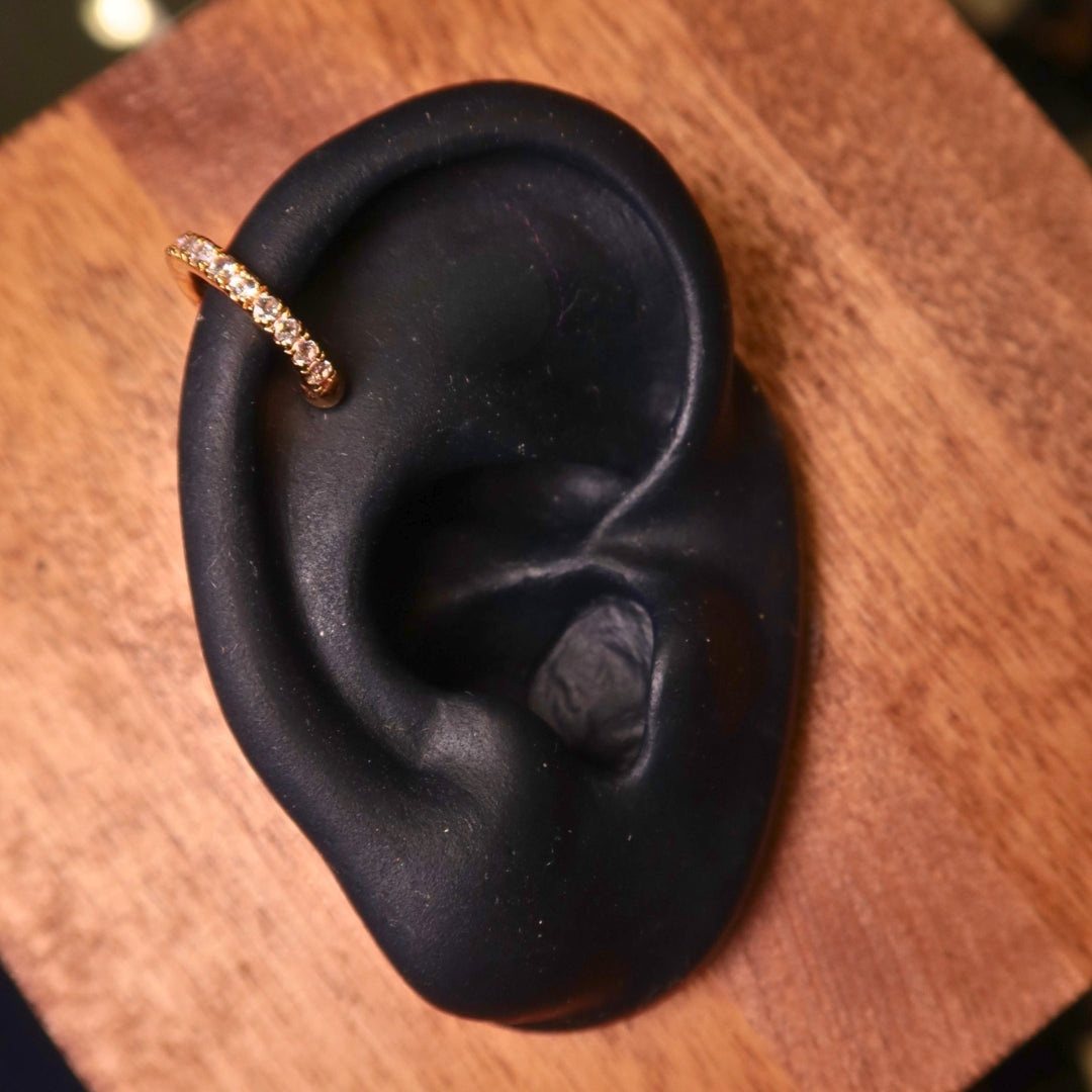 This cuff earring features a single line of captivating white sapphires, gracefully hugging the curve of your ear. The minimalist design allows the white sapphires to shine, making it an effortless accessory for everyday glamour.
