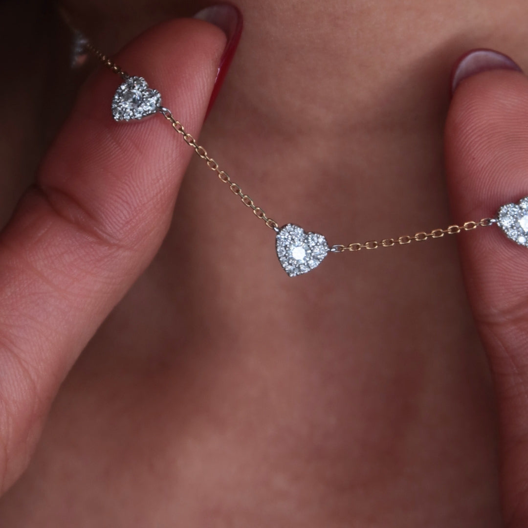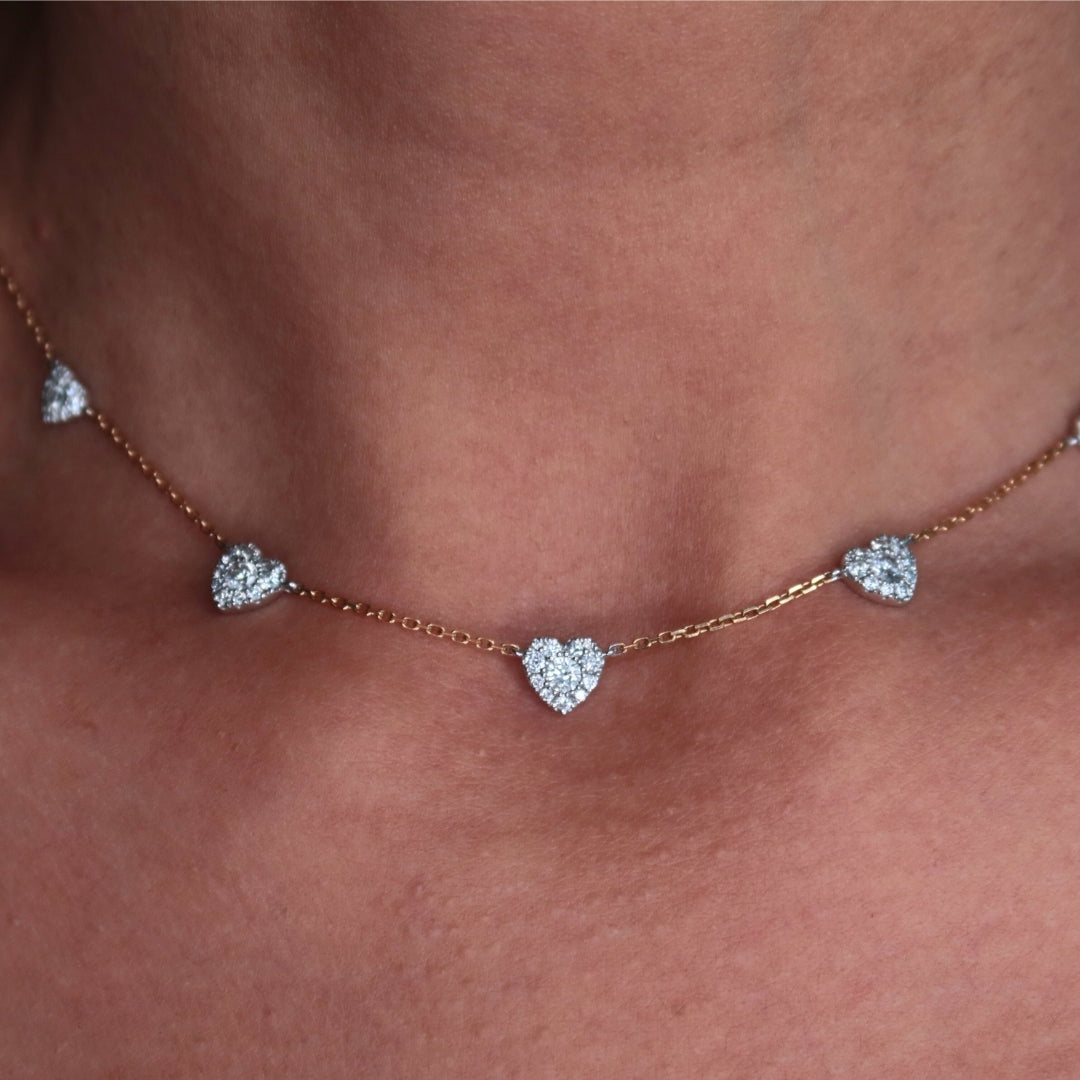 Modern romance. The Five Gradient Heart Diamond Necklace features five heart-shaped diamonds arranged in a graduated design in mix gold, creating a cascading effect with a minimalist appeal. Its versatile style makes it perfect for layering or wearing solo for a subtle statement.