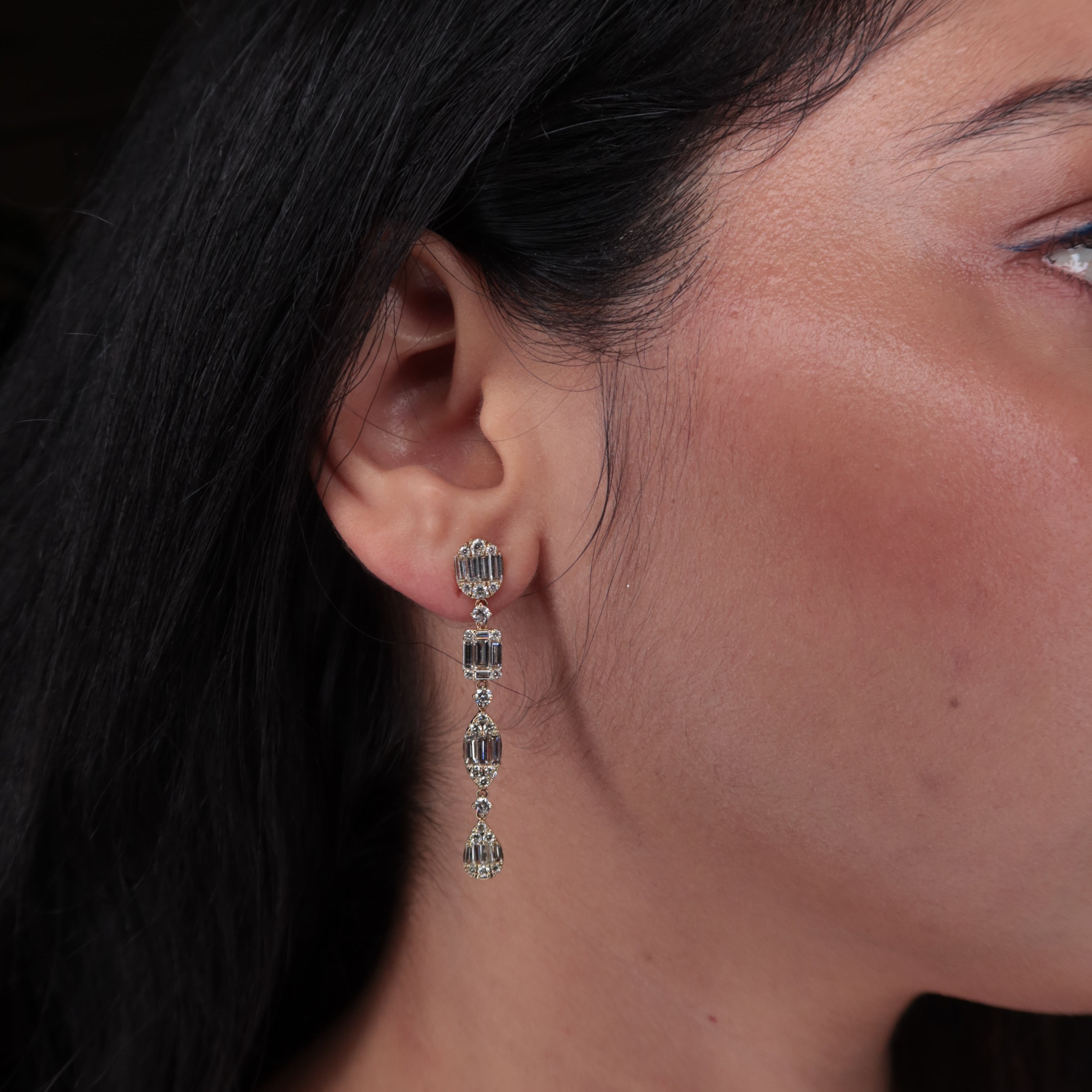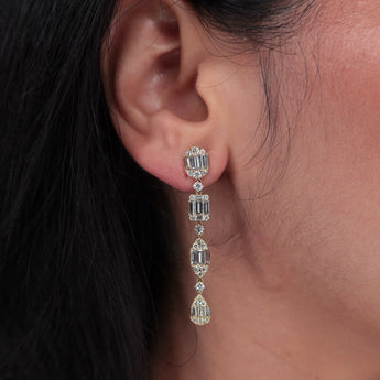 These elegant long earrings feature a graceful cascade of alternating oval and emerald shapes set in an illusion style. They are an ideal choice for adding a delicate yet striking touch to your look.