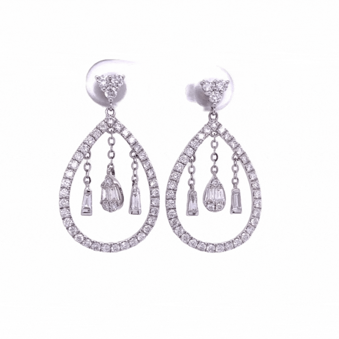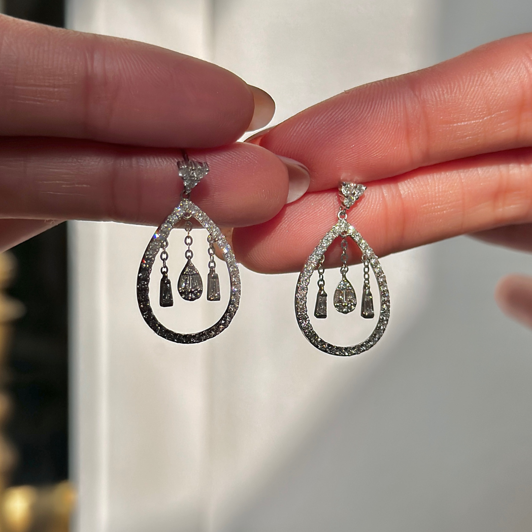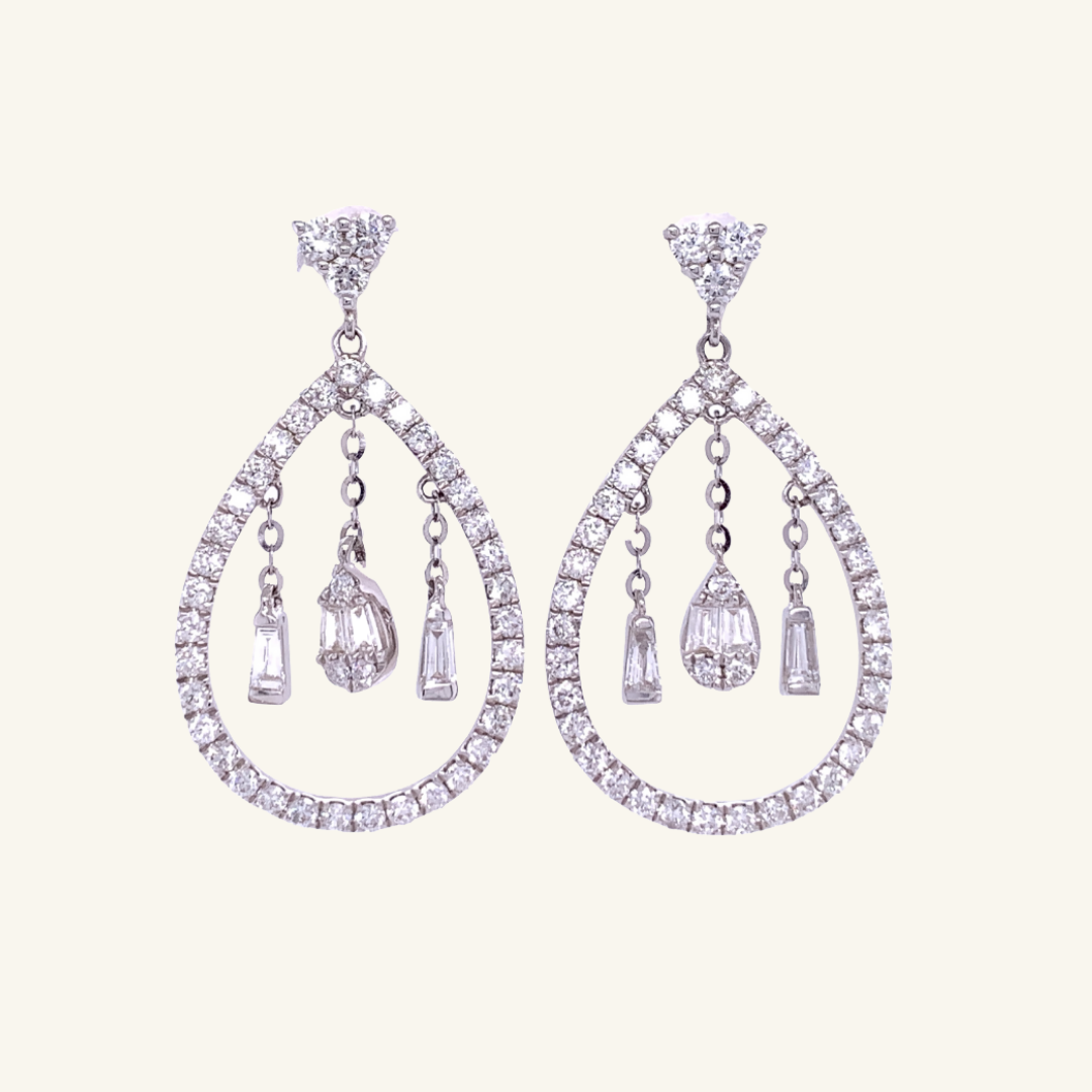 Baguettes and rectangle illusion set is suspended inside the circular & pear earrings, covered with round diamonds. Lillian Earrings are designed to shine even in the starry nights.