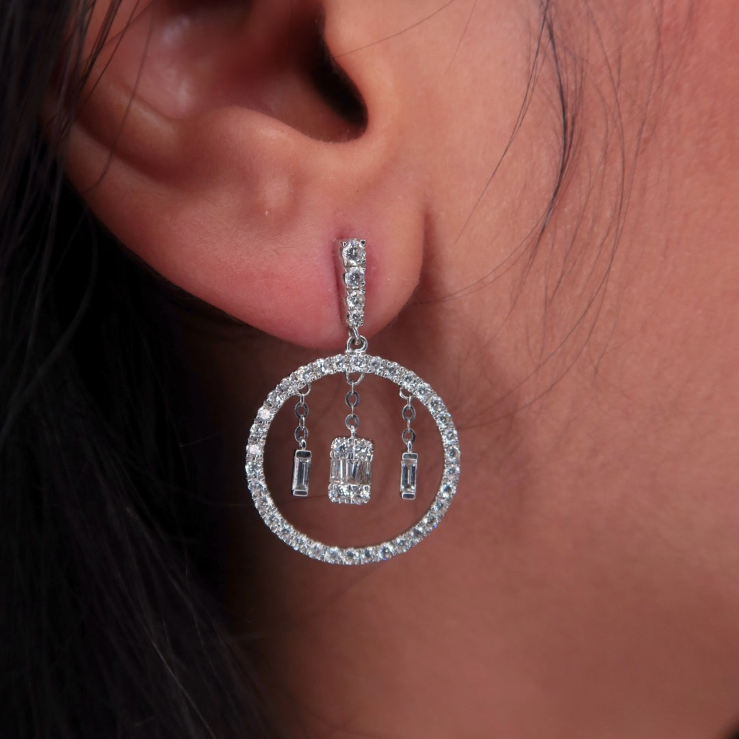 Baguettes and rectangle illusion set is suspended inside the circular earrings, covered with round diamonds. Lillian Earrings are designed to shine even in the starry nights.